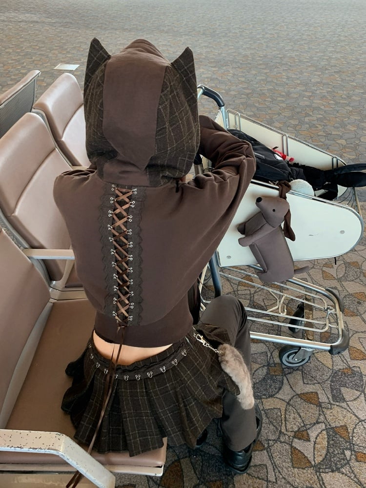 Cat Zip-up and Heart Lace Brown Hoodie with Lace-Up Applique Ear