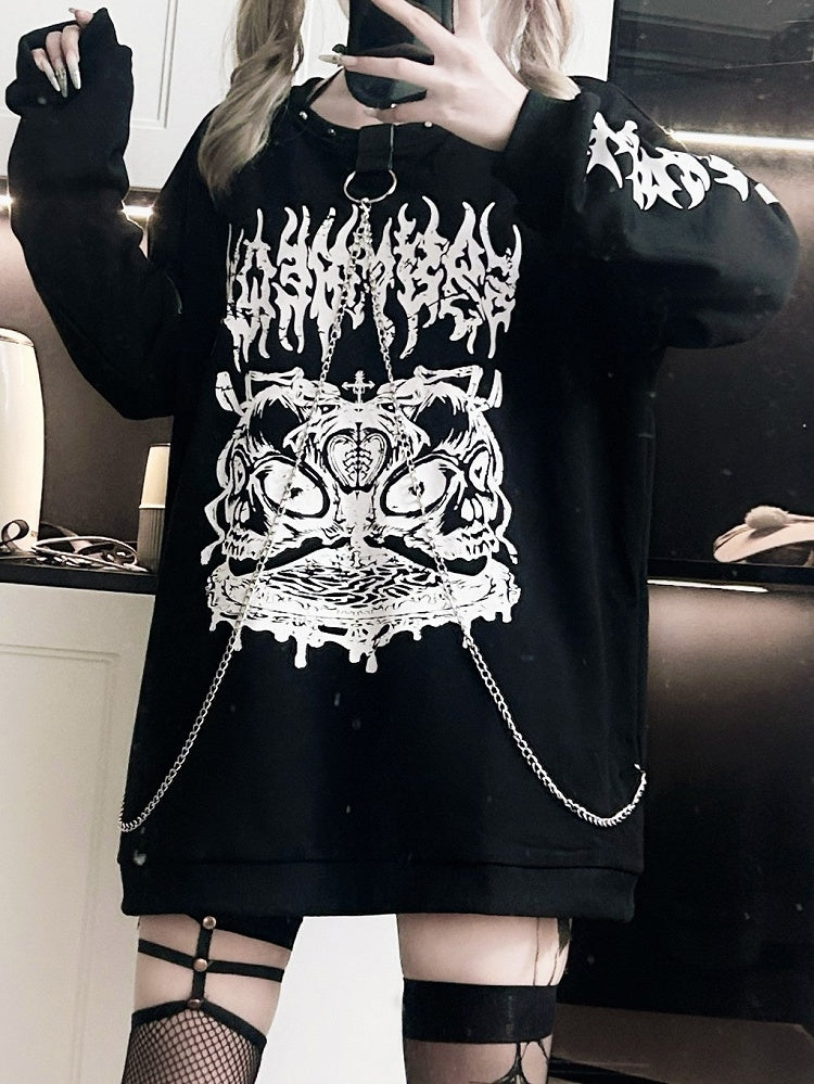 Gothic Chain-Embellished Black Pullover Sweatshirt with Studded Neckline & Zipper Sleeves
