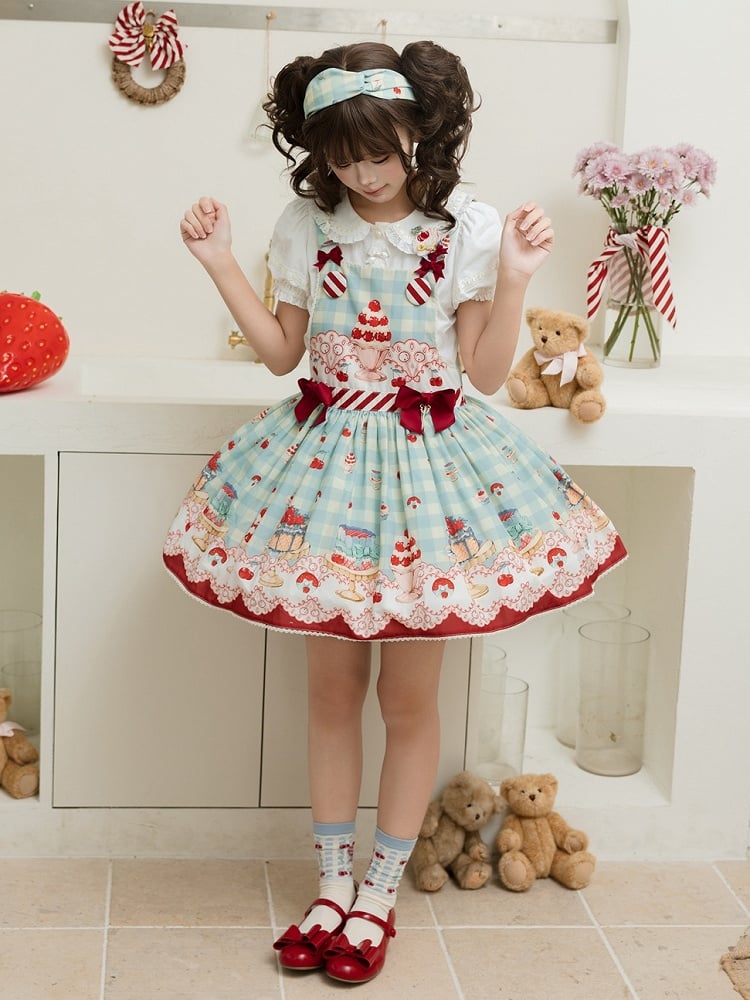 This adorable Mint Green Sweet Lolita Overall Dress features a charming cherry and dessert print. Perfect for adding a touch of cuteness to your wardrobe. Made from high-quality materials for comfort and durability.