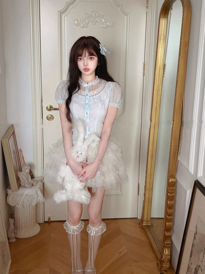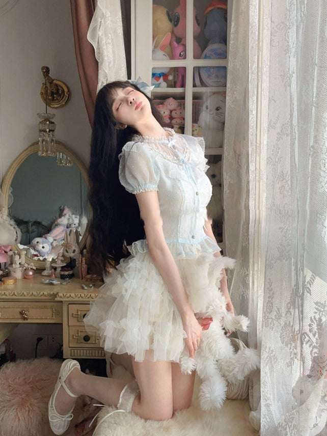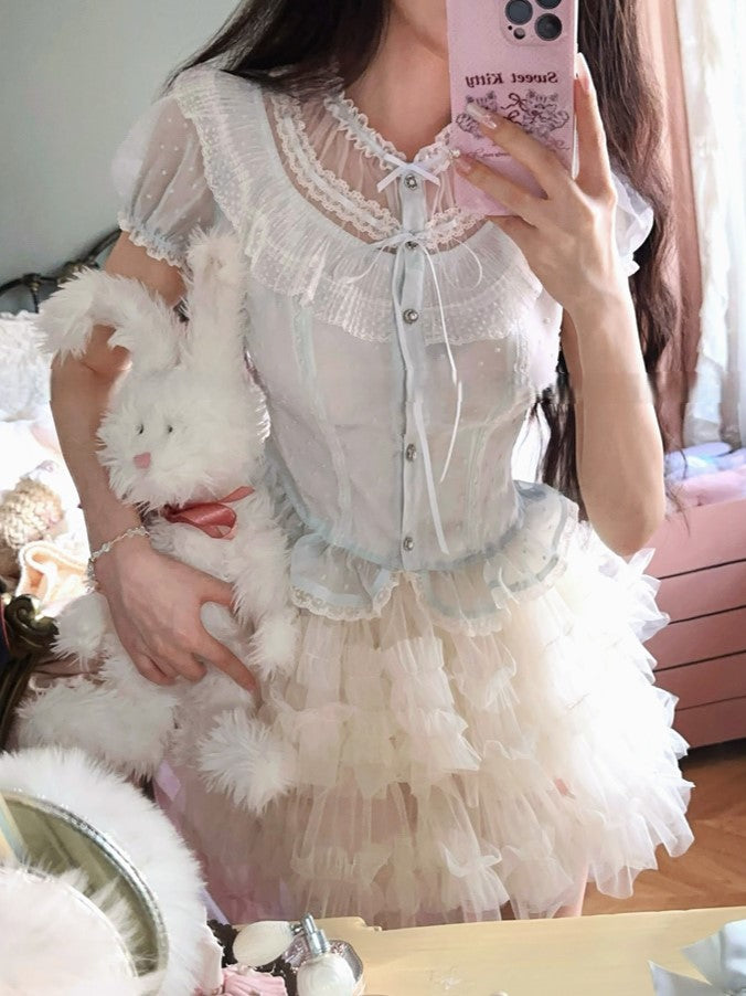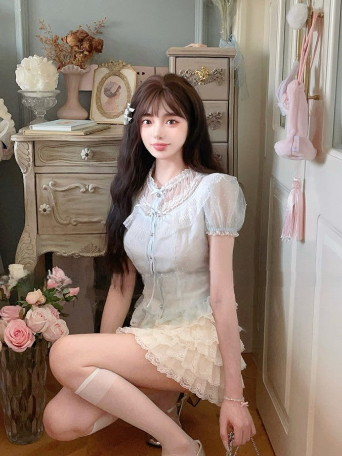Chiffon Puff Sleeve Blue Polka-dot Top