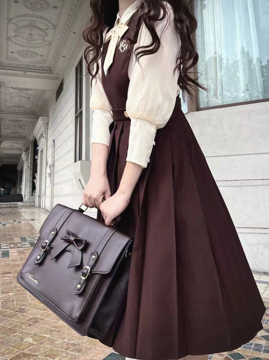 This adorable cream-colored chiffon skirt features a stylish v-neck design and is accessorized with a lovely ribbon. Perfect for pairing with your favorite college vest for a charming and chic look. Add a touch of cute to any outfit with this versatile and lovely skirt.