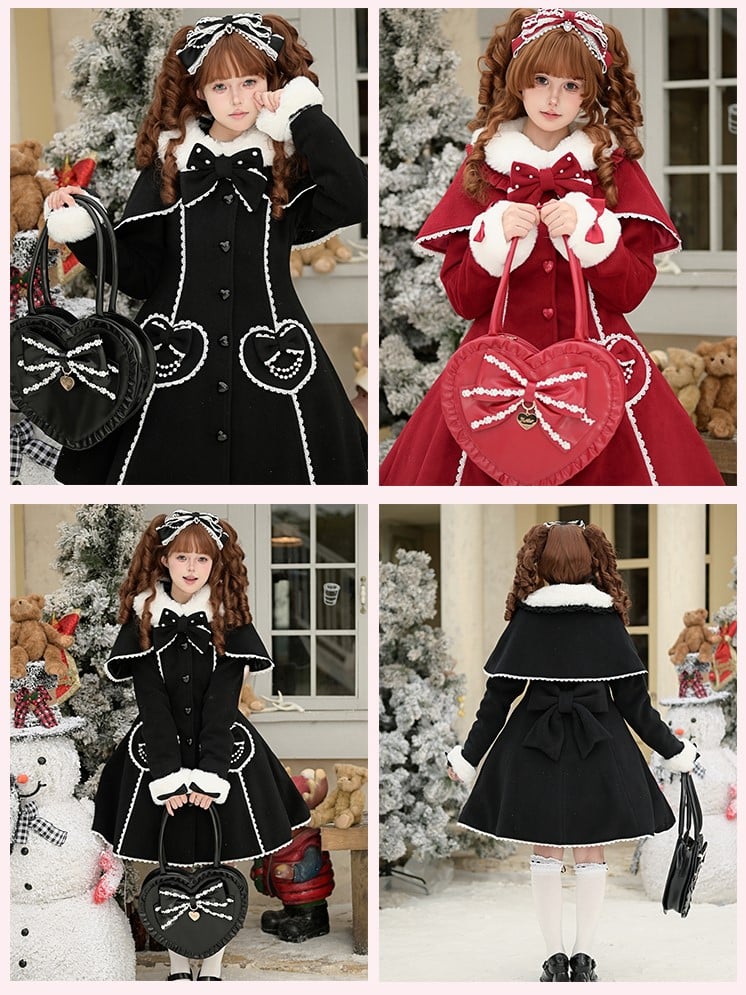 Christmas Red/Black Lolita Woolen Cape Coat with Heart Pockets & Beaded Chains and Plush Details