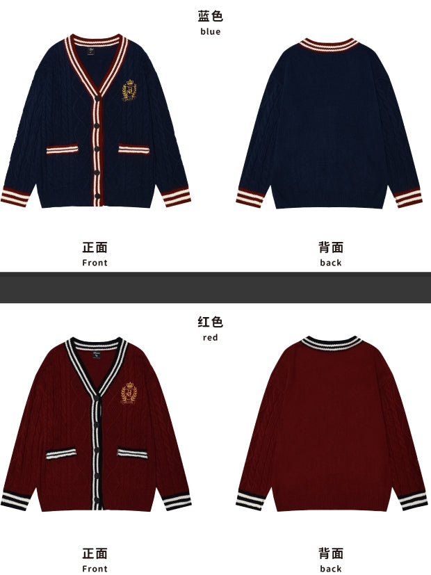 This Preppy Loose Cardigan is a festive addition to your wardrobe, featuring a Christmas red color and playful contrast striped trim. Stay cozy and cute during the holiday season.