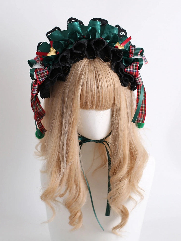 Christmas-Themed Ruffled Hairband with Plaid & Pom-Poms