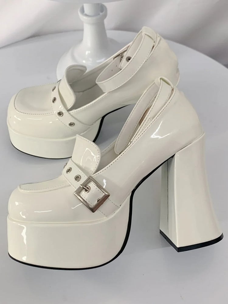 Chunky Heel Y2K White Shoes - Platform Sole with Ornate Buckles & Removable Ankle Harness