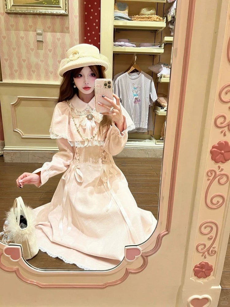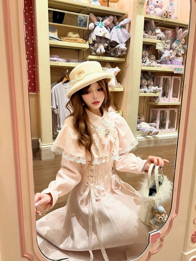 Jirai Kei Pink Thick Wool Cape Dress with Waist Lacing Clean & Innocent Style