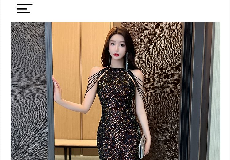 Cold-Shoulder Sequin Strappy Mini Sheath Dress