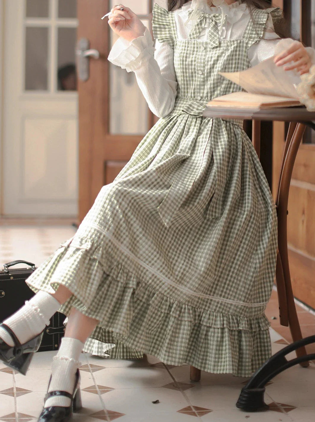 Collar Dress Shirt Ribbon Check + Set Ruffle French Shoulder Green Ruffle Forest