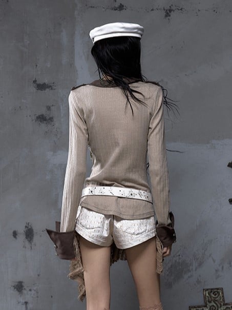 Khaki Vintage Punk Knit Top with Brown Suede Notched Collar & Military Gold Braid