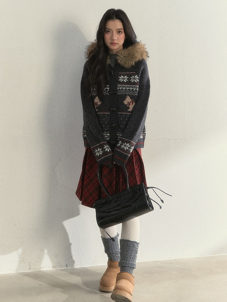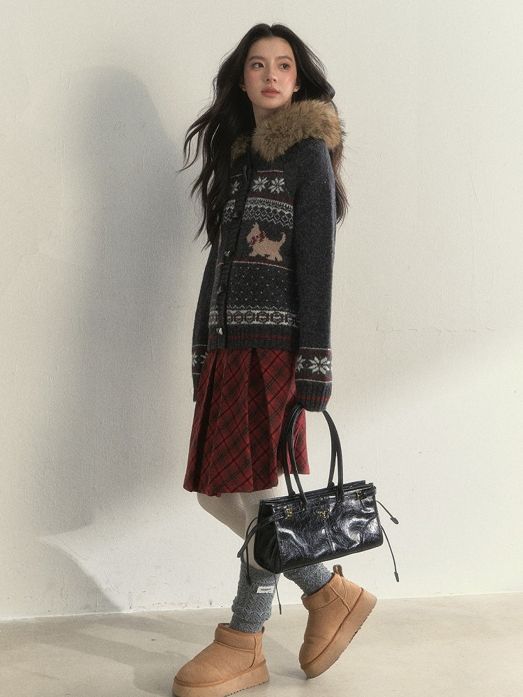 Collar Knit Sweater Button Vintage with Grey Fur Toggle