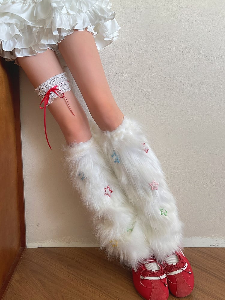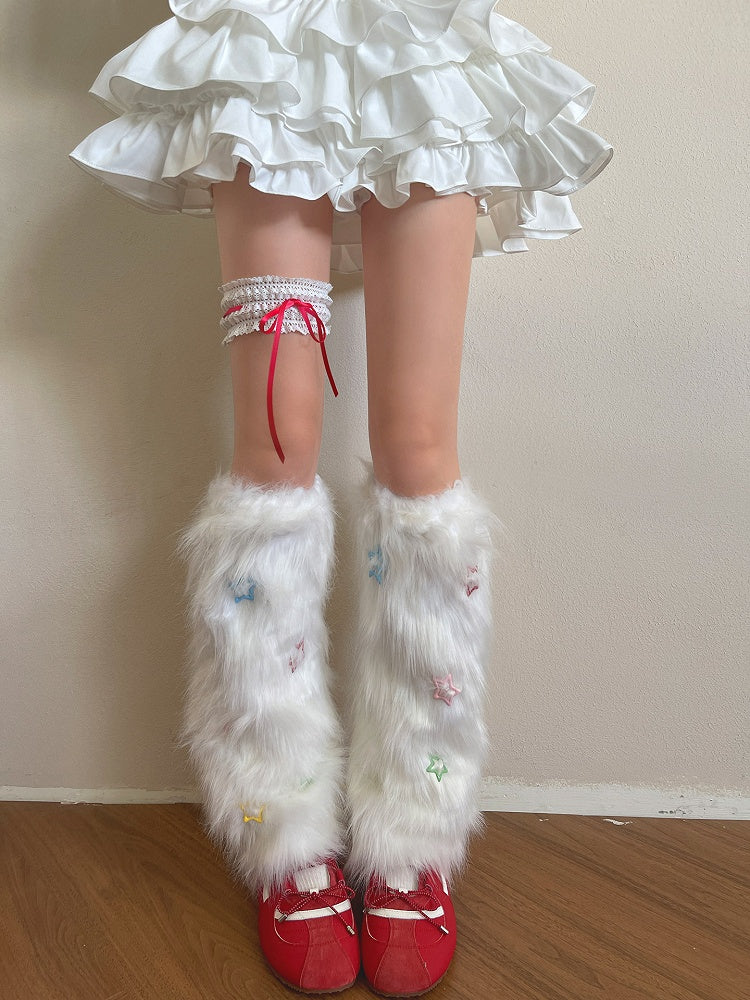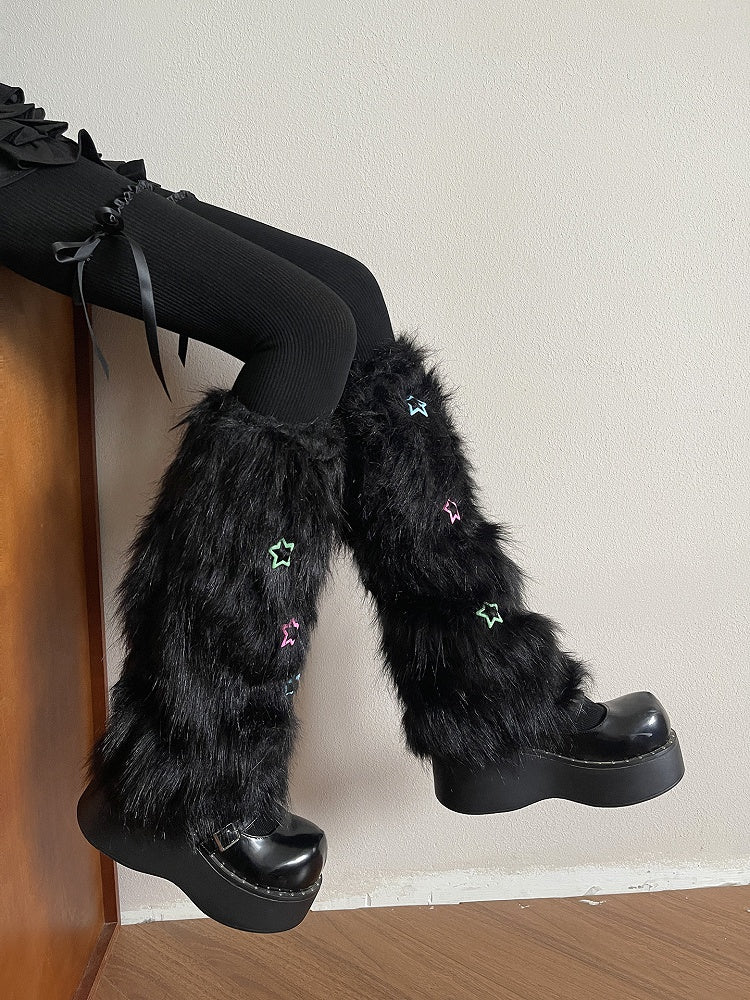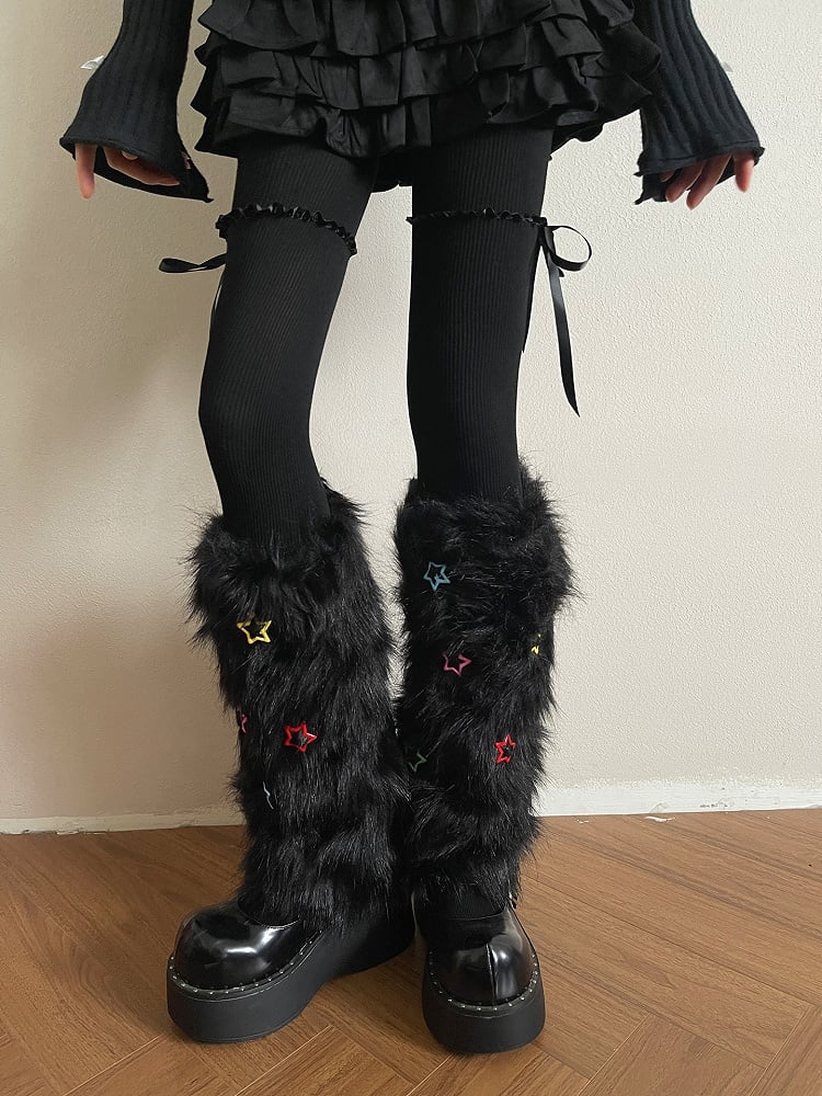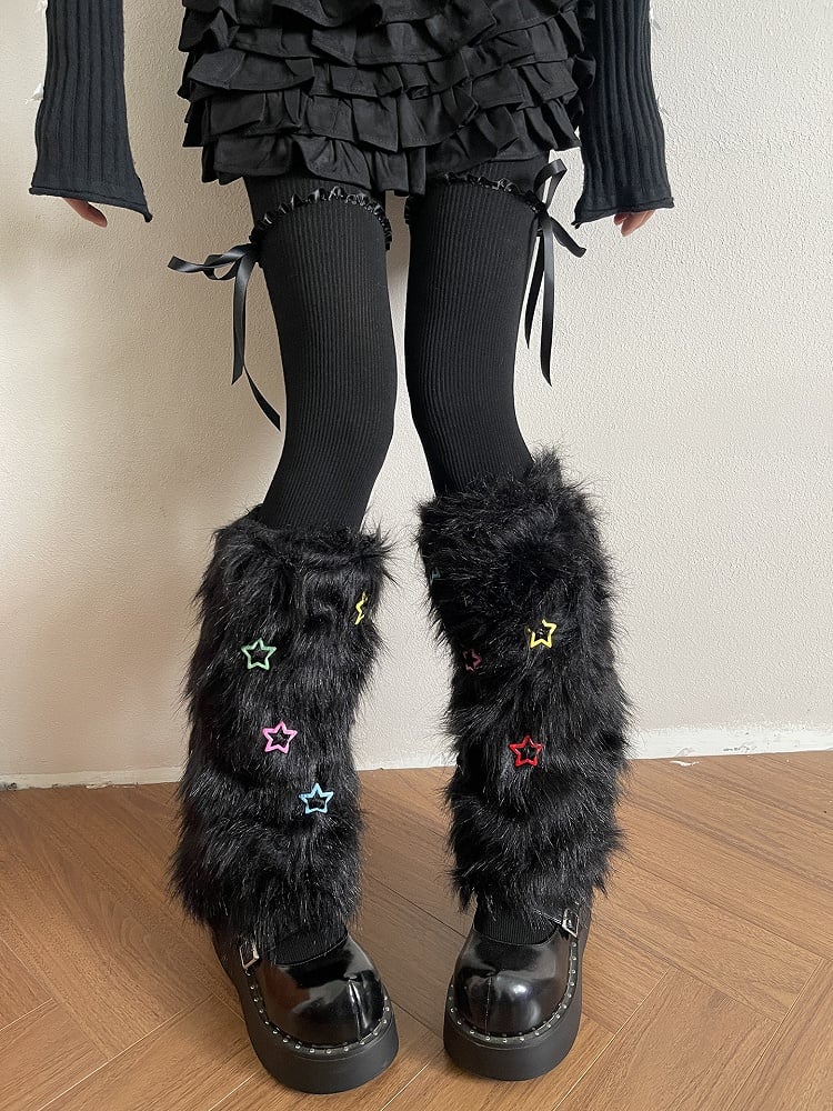 Black/White Y2K Plush Leg Warmers with Colorful Star Decorations