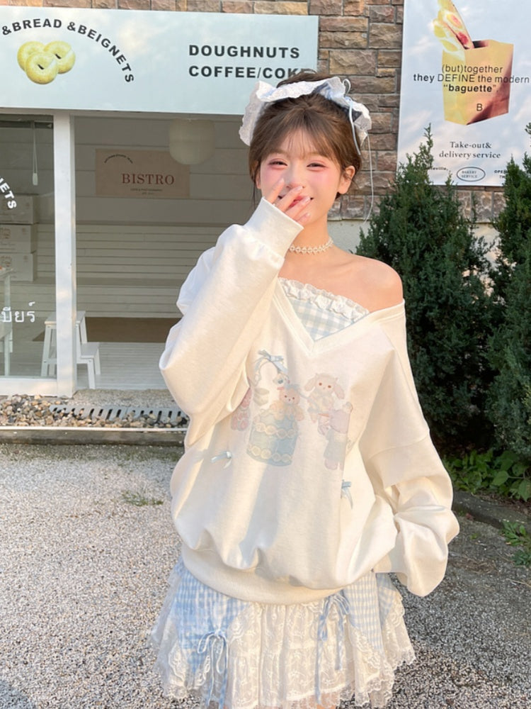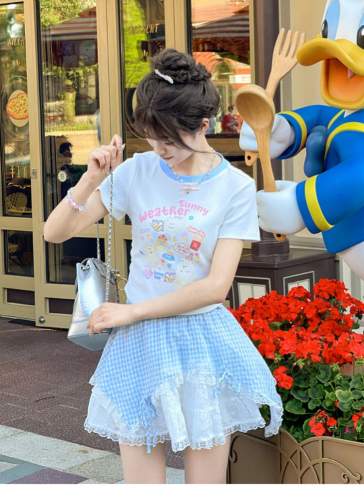 Contrast Lace Patches Blue Plaid Elastic Waist Bowknot Details Skirt
