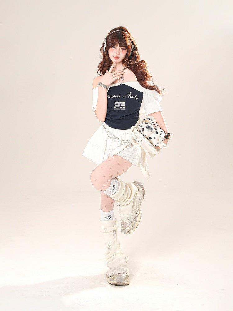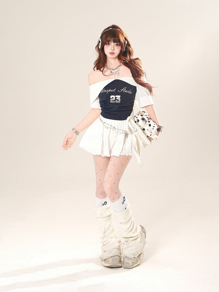 Core T-Shirt Navy Blue Colorblock Design Neckline Blokette Off-the-shoulder