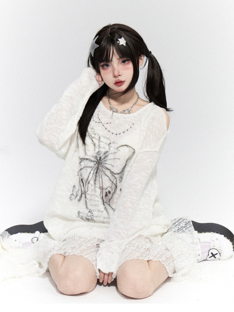 Butterfly Print Cutout Shoulder White/Black/Apricot Semi-sheer Coverup
