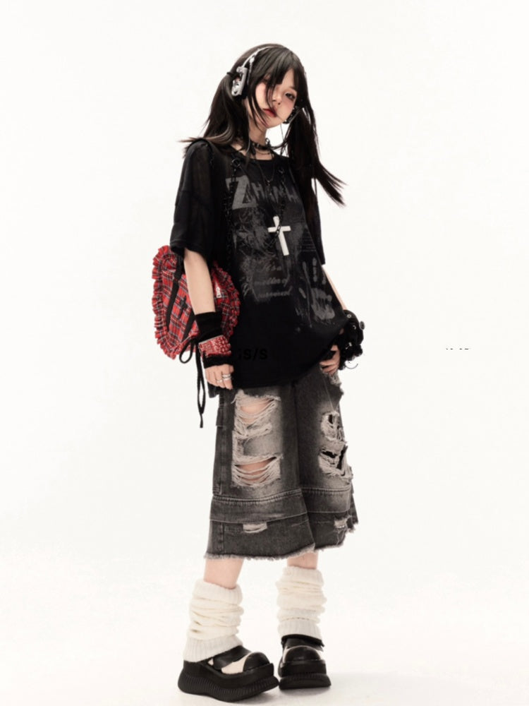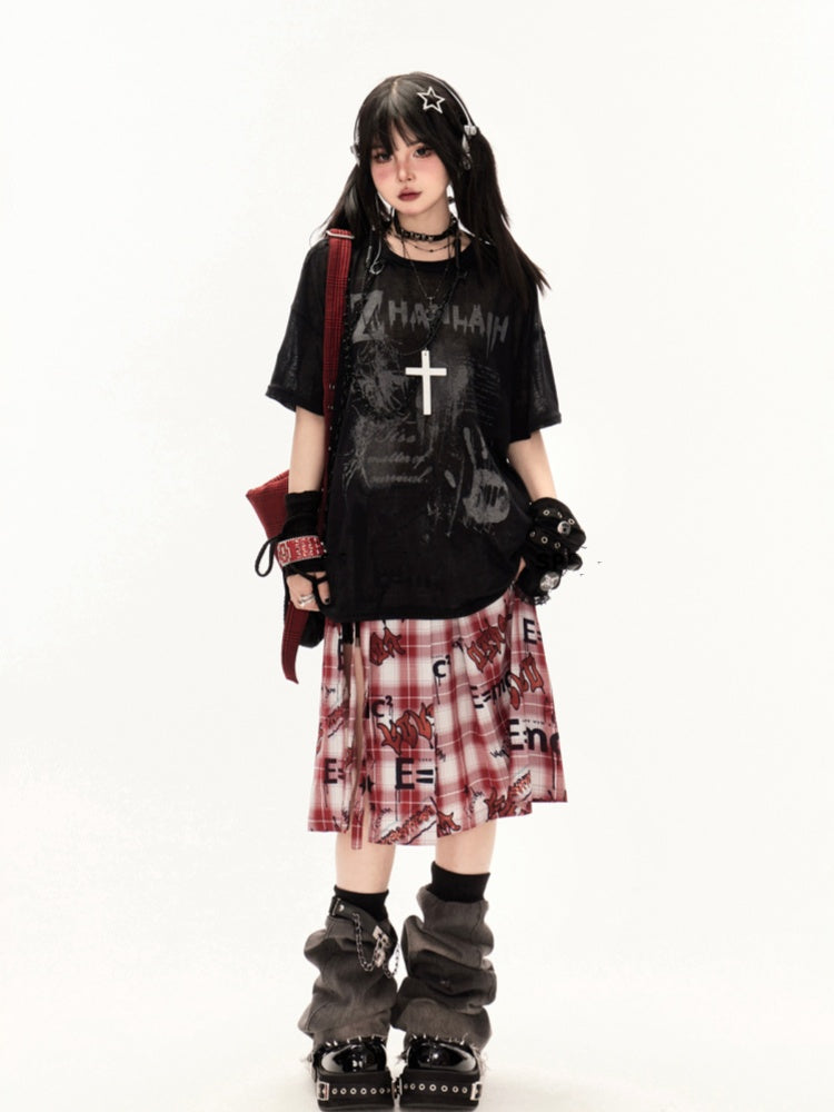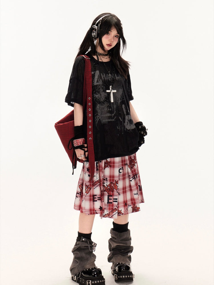 White/Black Round Neck Punk Print Semi-sheer Coverup