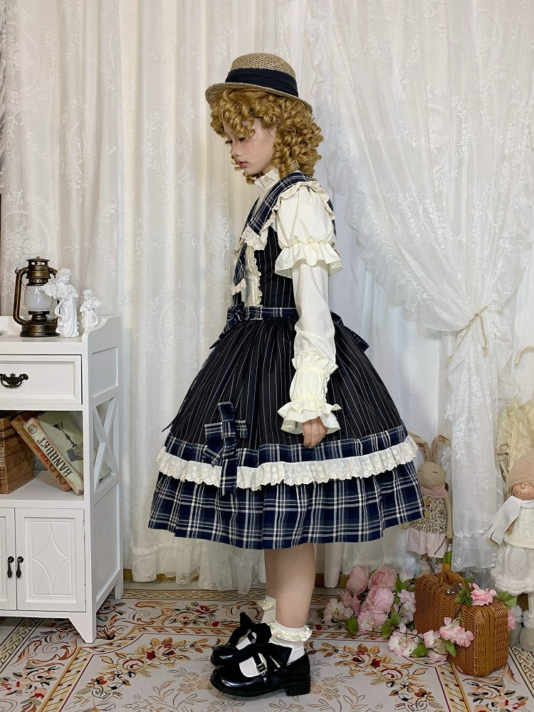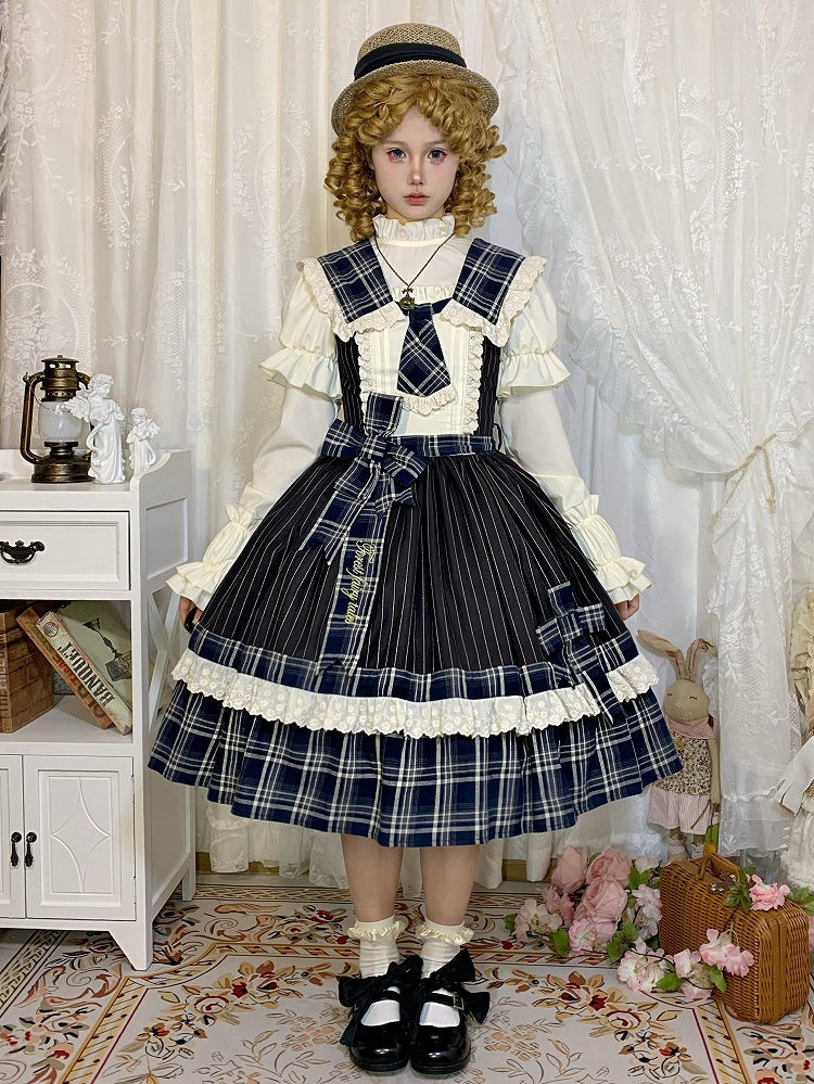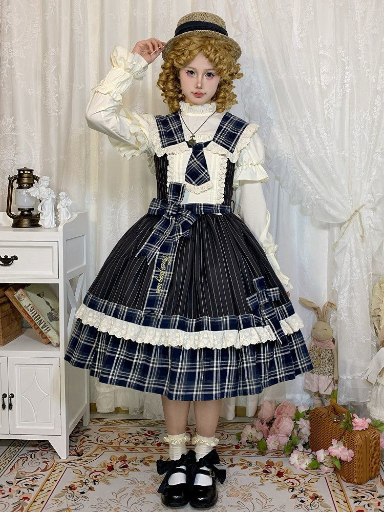 Blue and White Old School Lolita Fashion Dress Bowknot Detais JSK Set