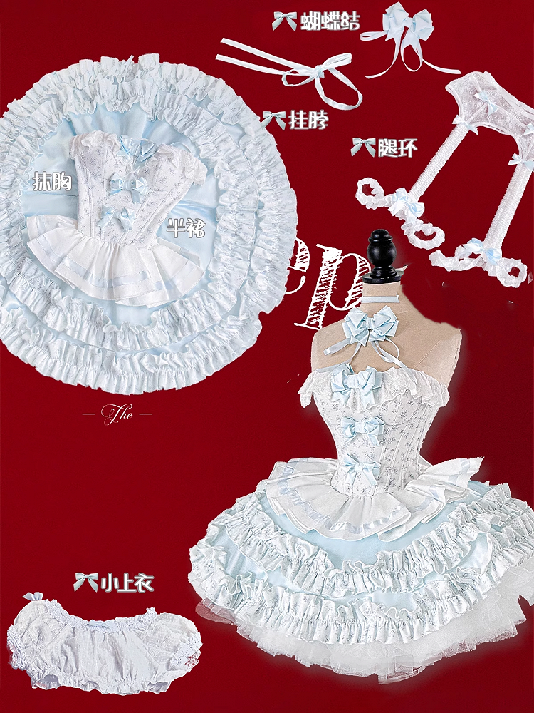 Blue and White Old School Lolita Fashion Dress Bowknot Detais JSK Set