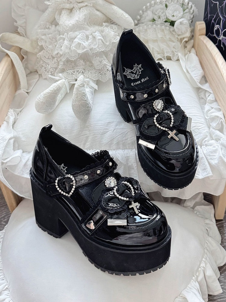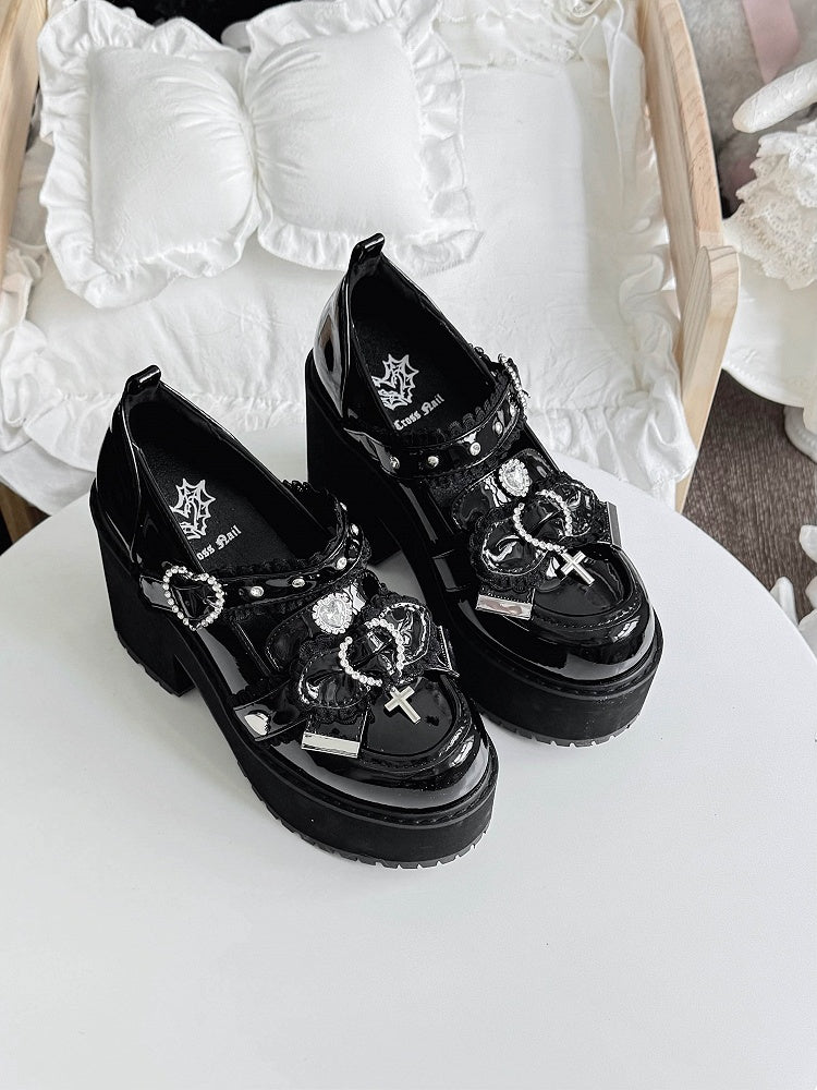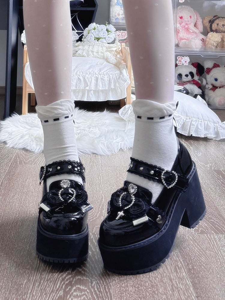 Bow & Cross Charm, Heart Buckle & Lace Trim - 9.5cm Block Heel Jirai Kei Mary Janes in Black