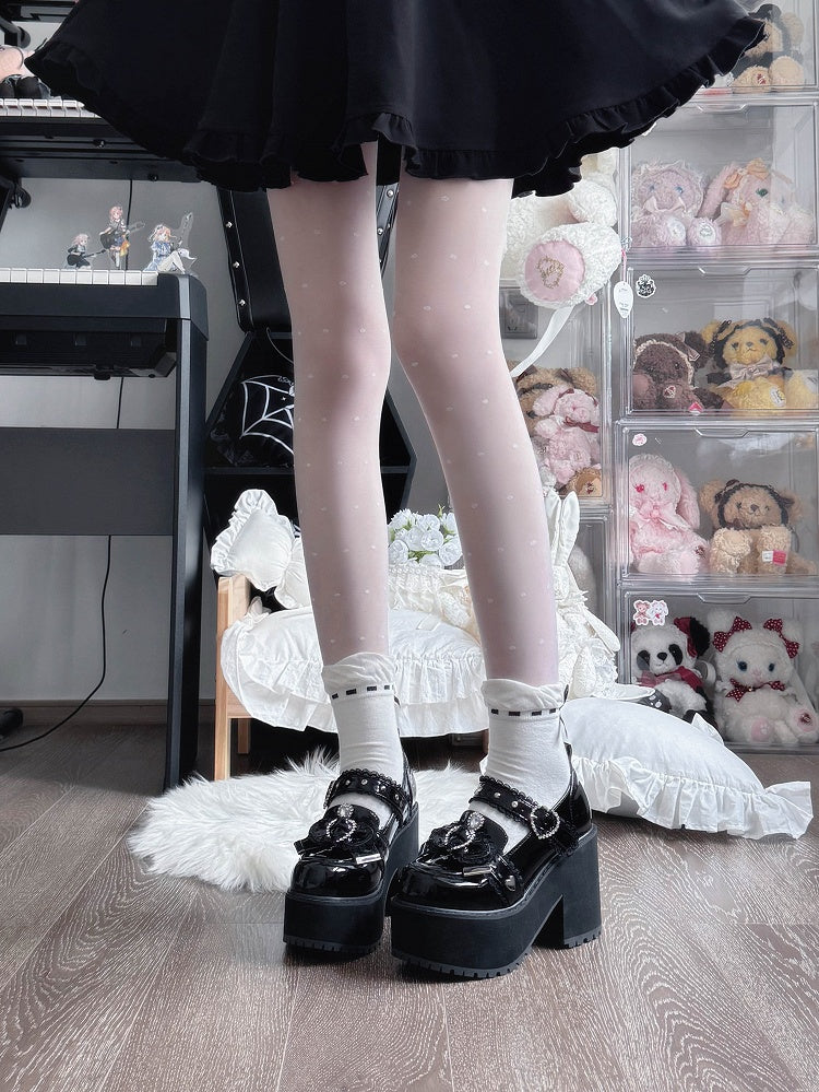 Decorated Lolita Multi-Layer Calf White/Black Bow Trim Lace Socks