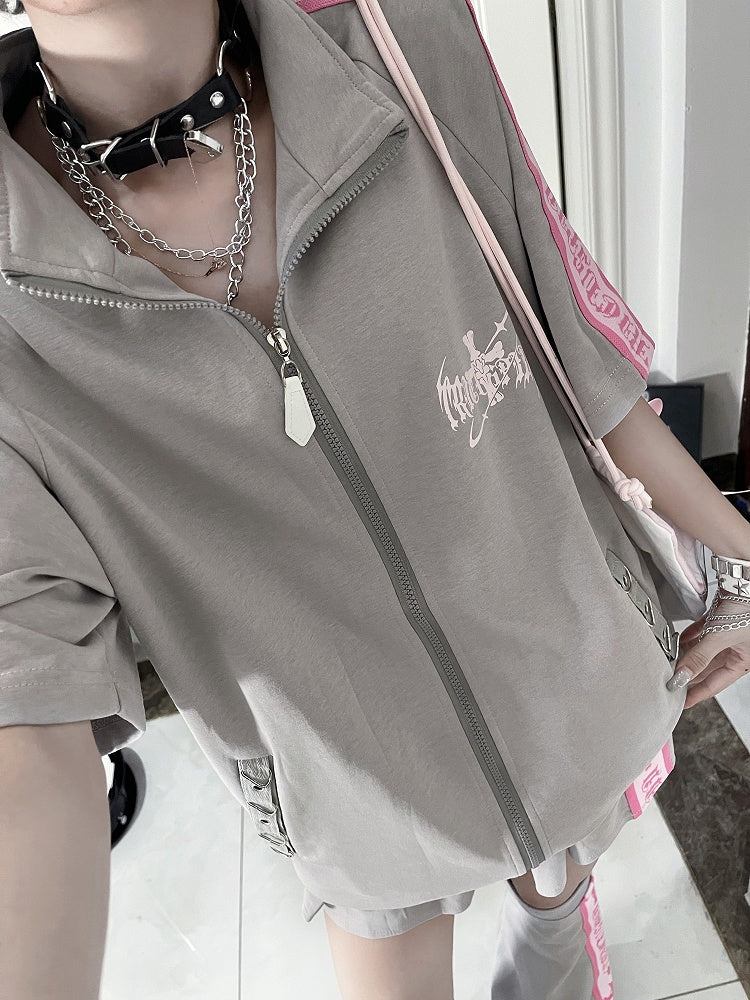 Gray Punk Short Sleeve Zip-Up Jacket with White Cross Print & Pink Text Stripes