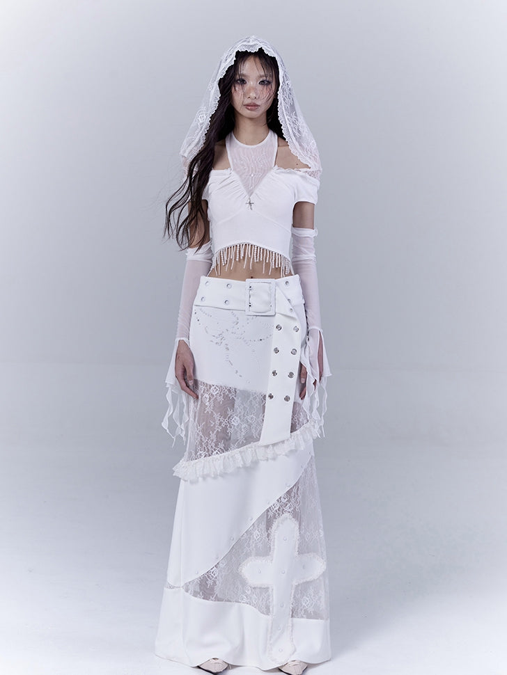 White Low Waist Lace Patches Cross Applique Punk Skirt with Buckle Belt