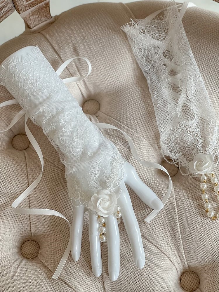 Black/Apricot/White Gothic Lace Wrist Cuffs with Flower and Bead Embellishments