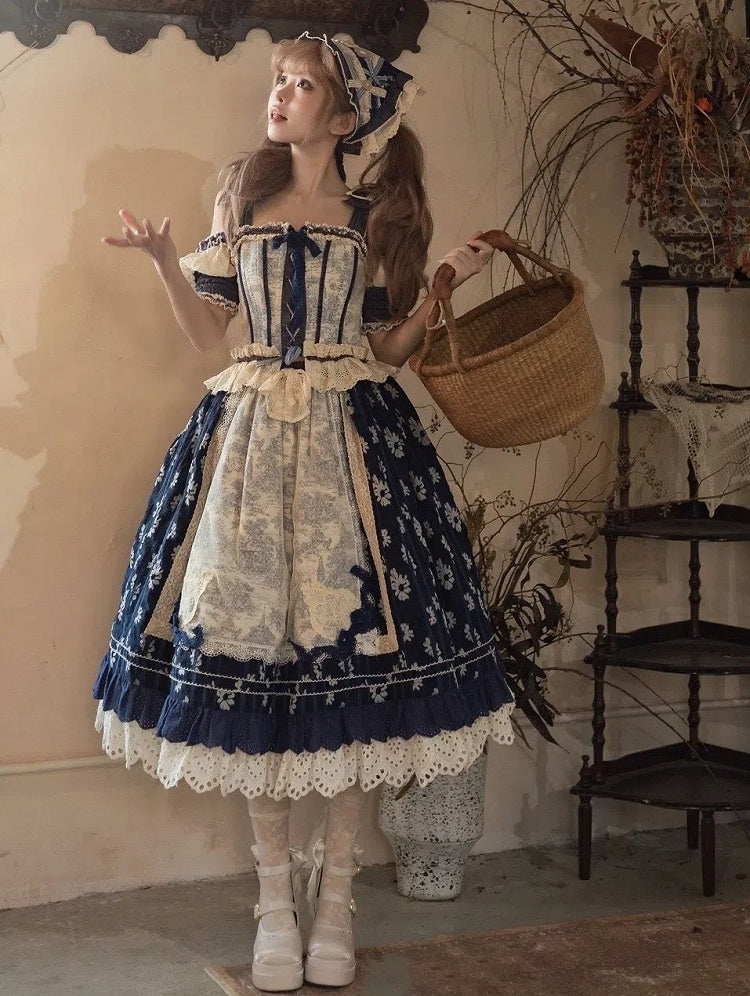Blue and White Old School Lolita Fashion Dress Bowknot Detais JSK Set