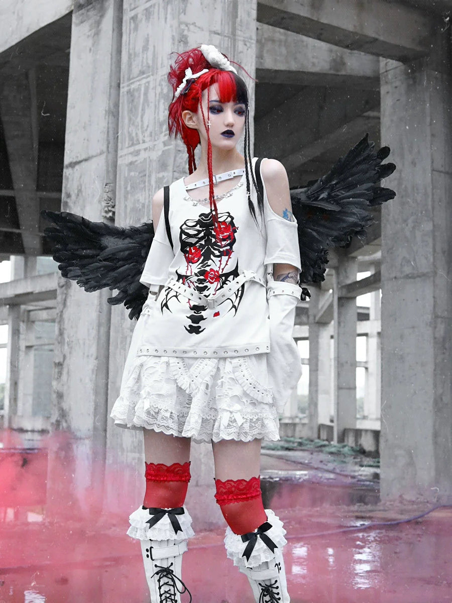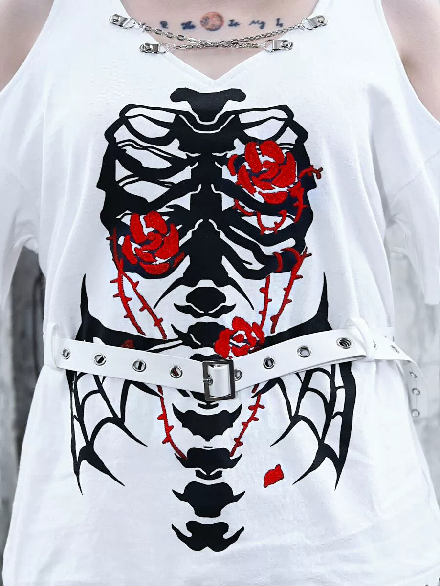 Dark Top Sleeve Chain Knit T-Shirt Strap Split