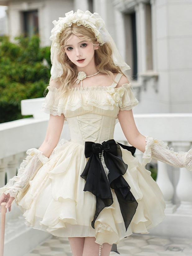 Black and White Old School Lolita Fashion Dress Bowknot Lolita JSK Set