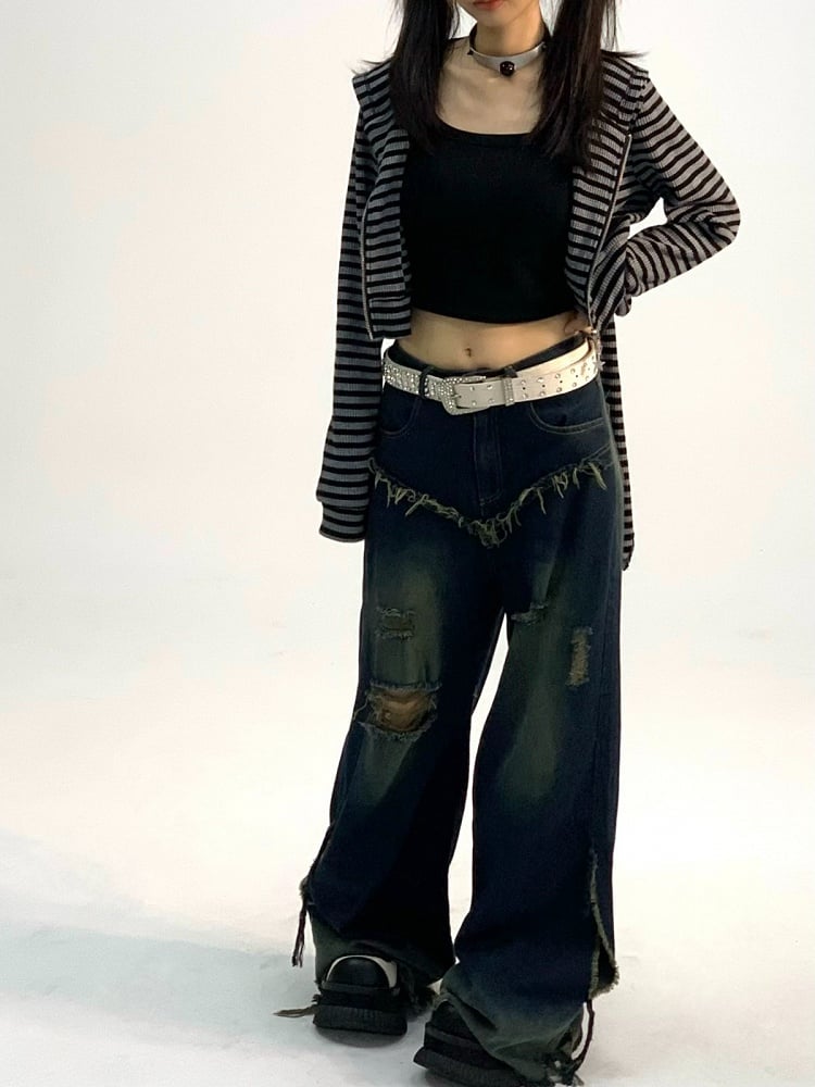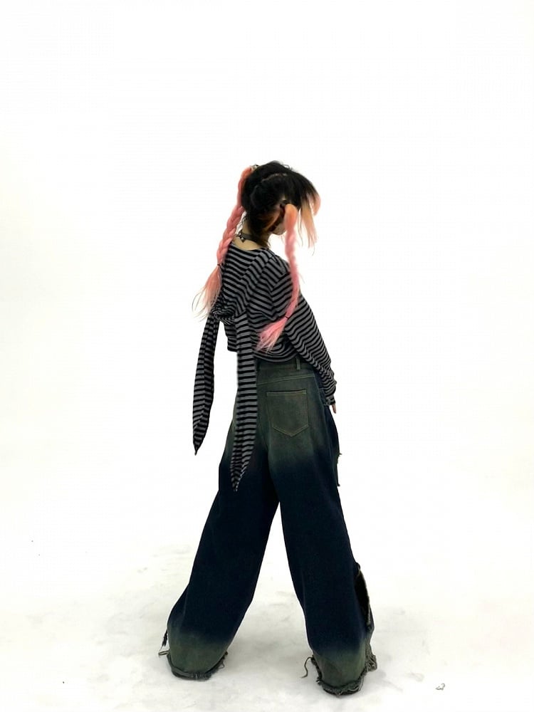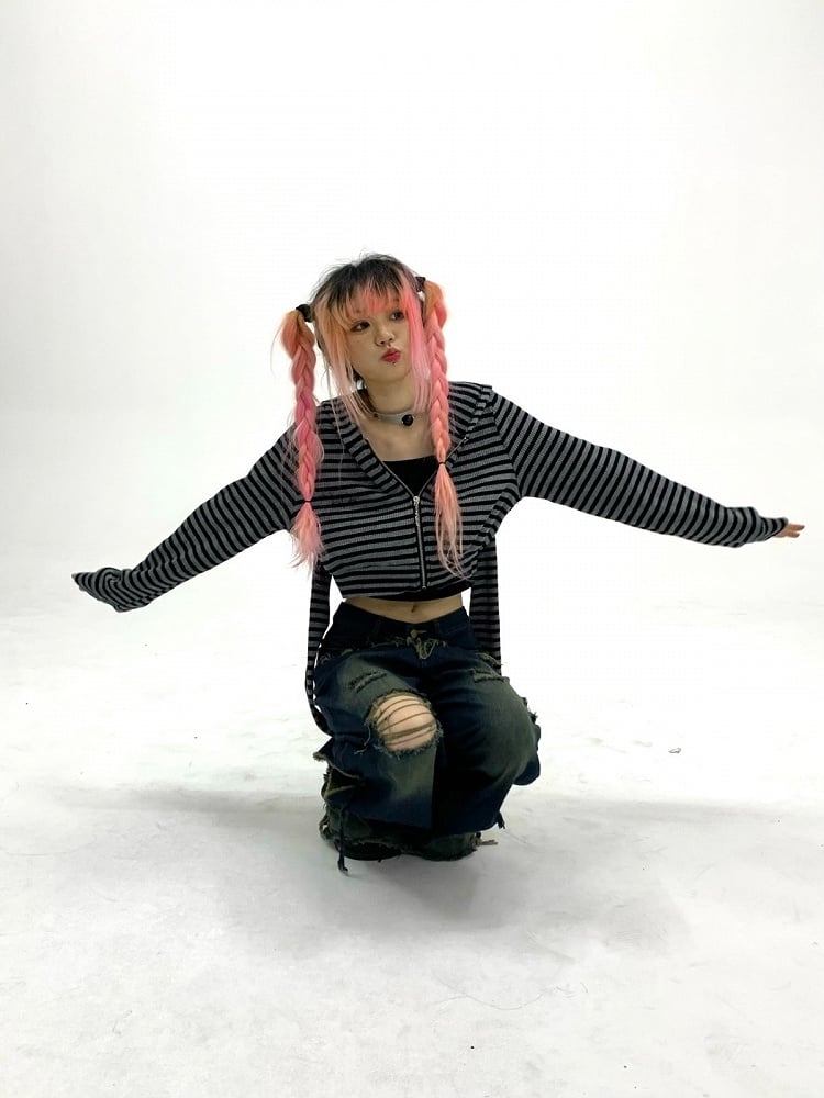 Decorated Striped Bunny Sleeve with Hoodie Ears Long