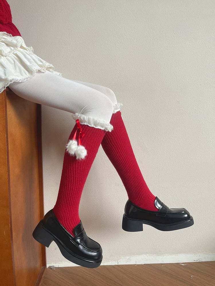 3 Colors Curly Fur Ruffle Calf Socks with Pom-Pom Decoration