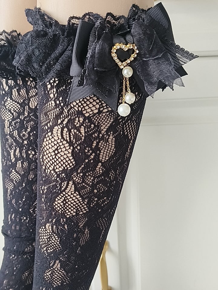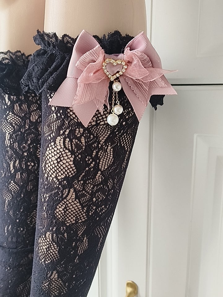 3 Colors Jirai Kei Hollow-Out Design Lace Trim Calf Socks with Bow Decoration
