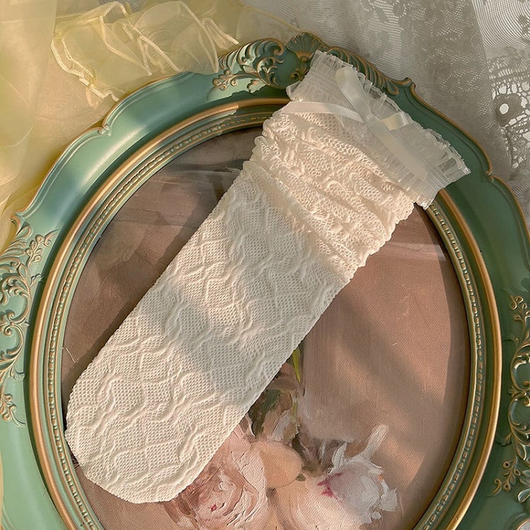White/Light Yellow/Black 3D Lace Calf Socks with Ruffled Trim and Bow Decoration