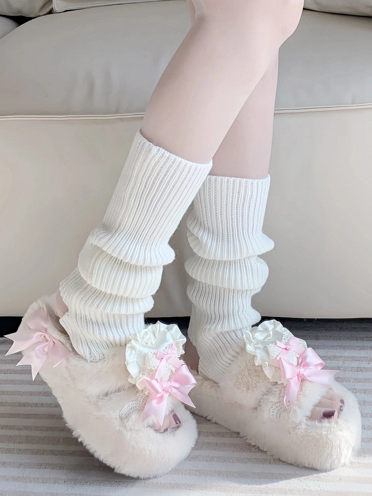 Decorative Knotted Bow, Ruffled Heart Decor & Lace Details Plush White 7cm Platform Slippers in Sweet Lolita