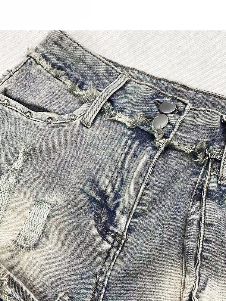 ● Button Closure and Zip Fly / Distressed Design / Raw Hem / Slant Front Pockets