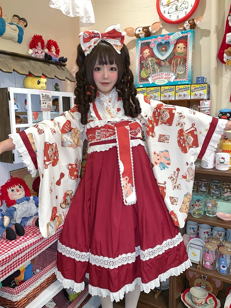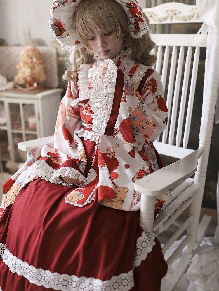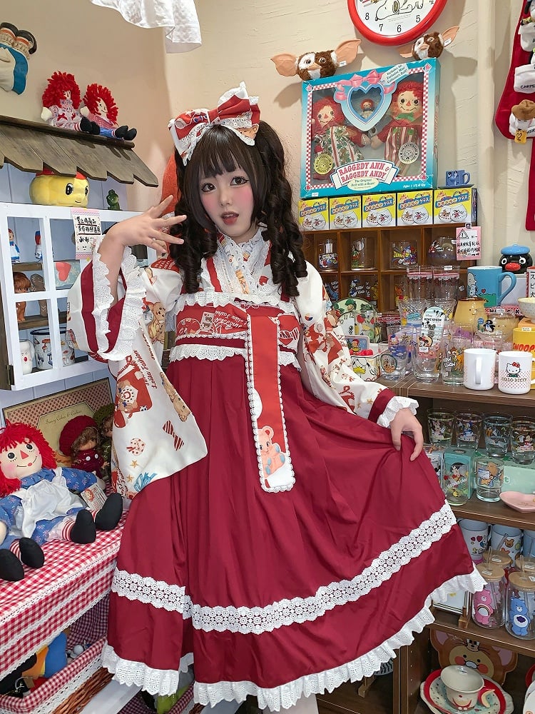 + Design Print Trimmed Set Wa Lolita Bear Beige Lace Top Crossover Dress JSK Red