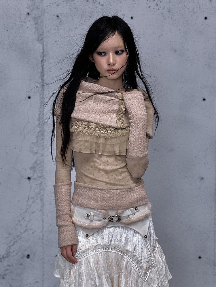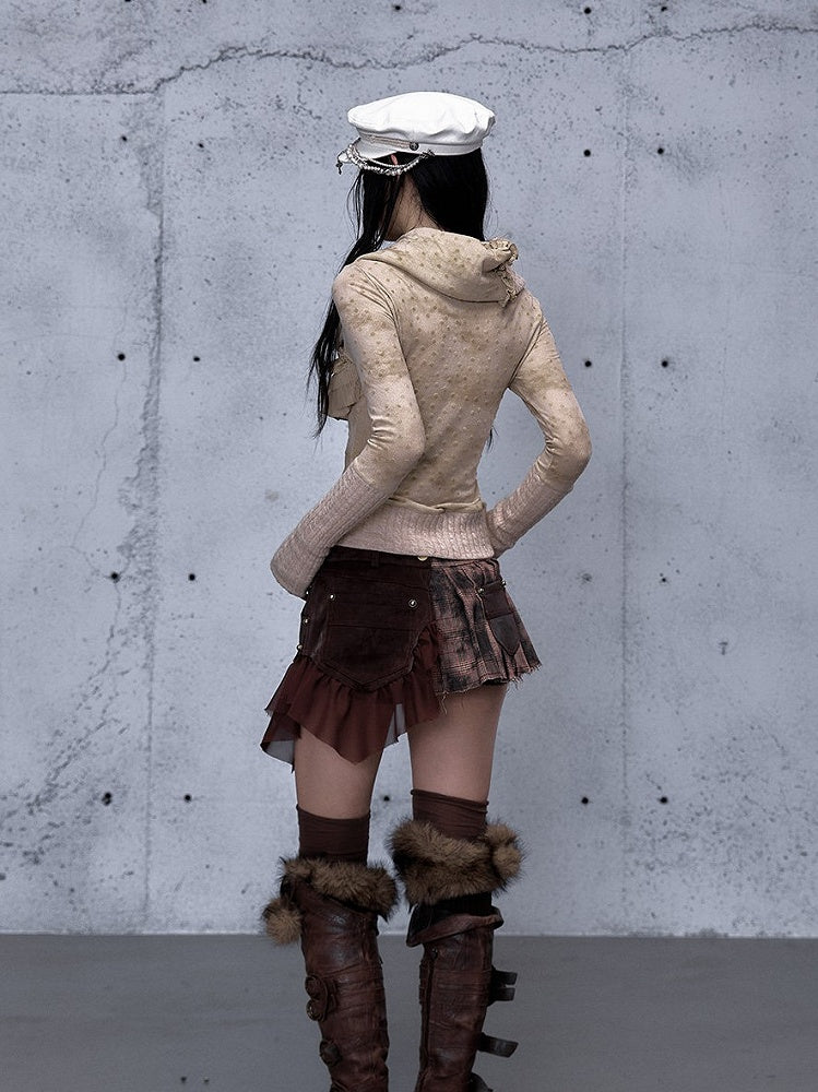 Detachable Sleeve Polka-dot Punk Vintage with Scarf Pattern Top Apricot Long