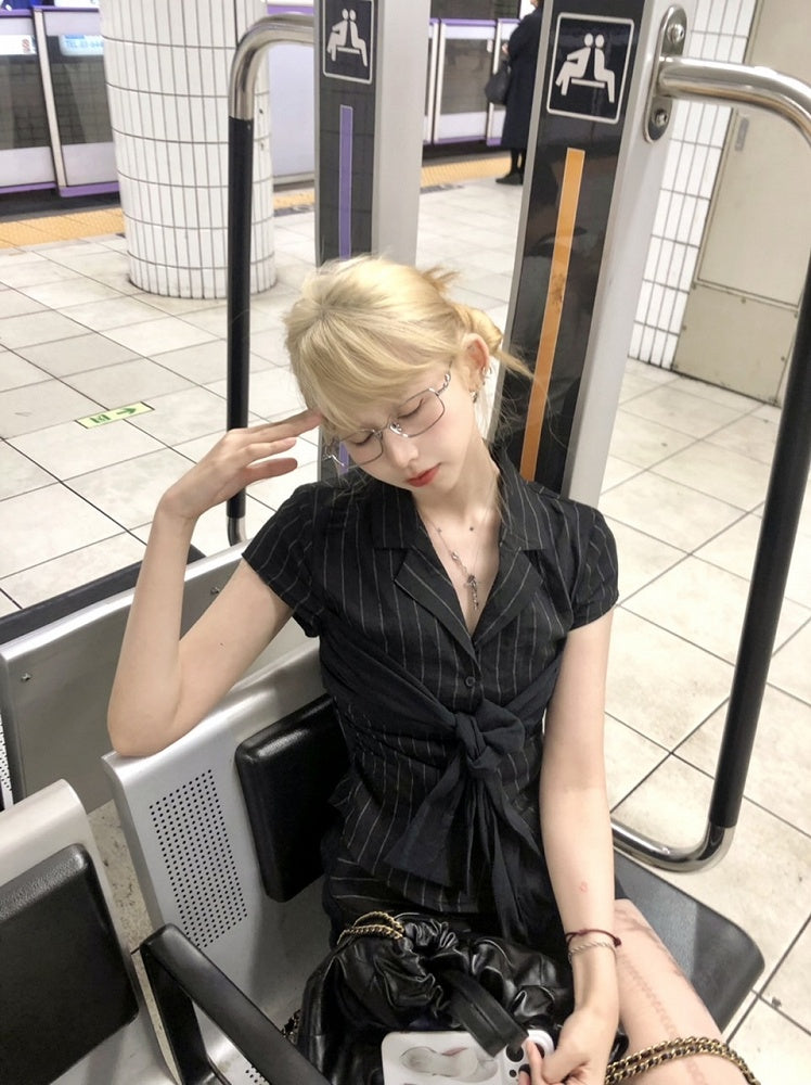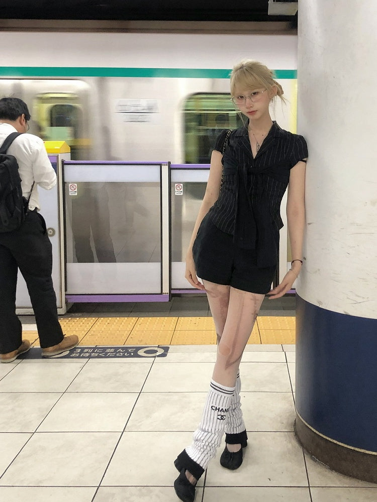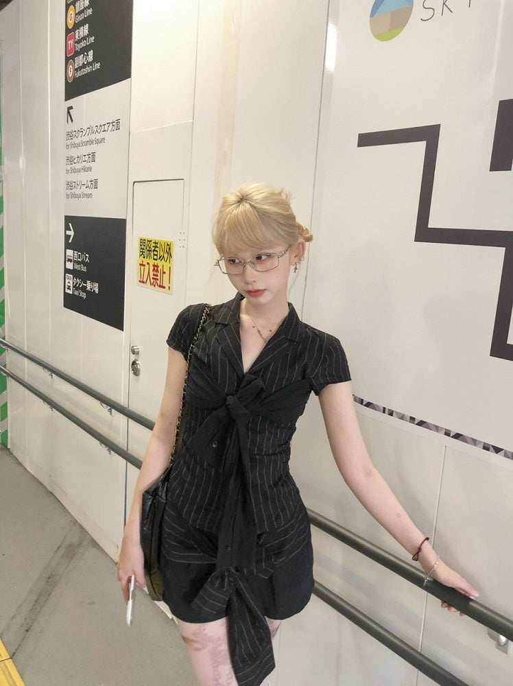 Black Striped Button Placket Shirt with Front Tie Bow Detail