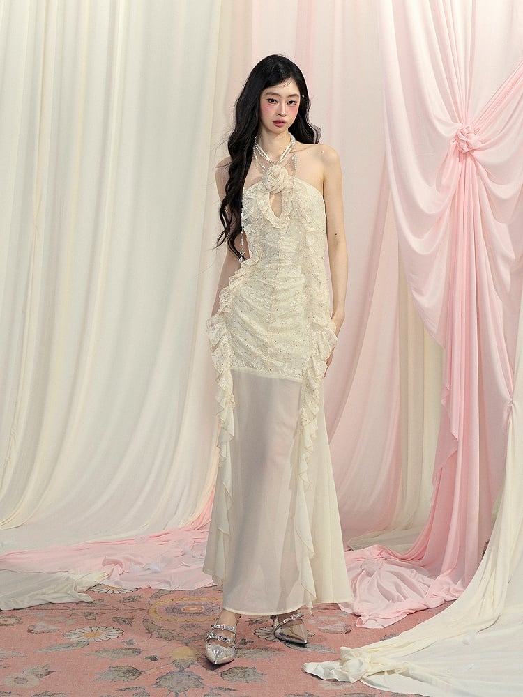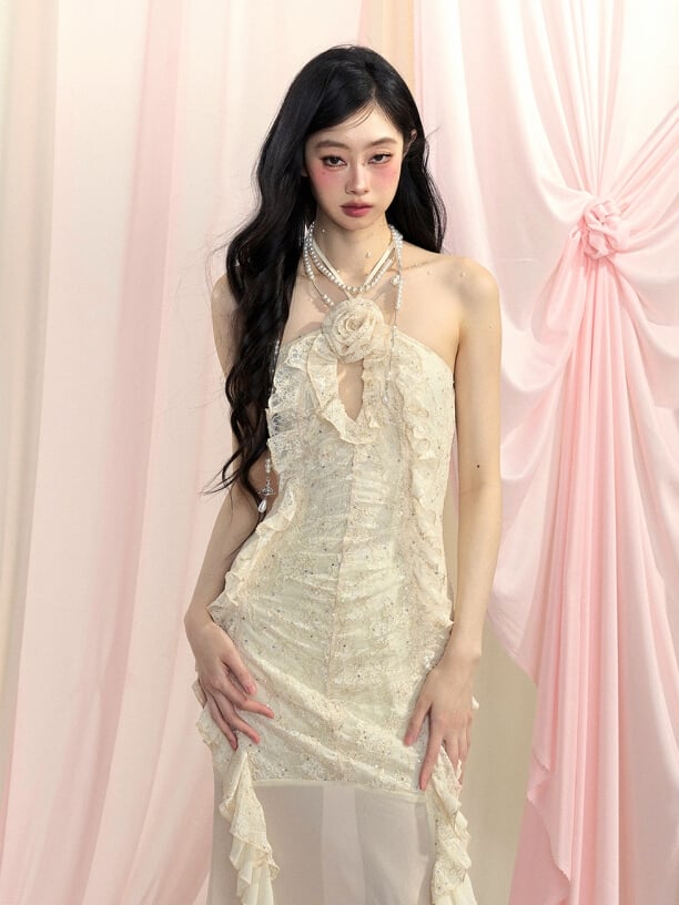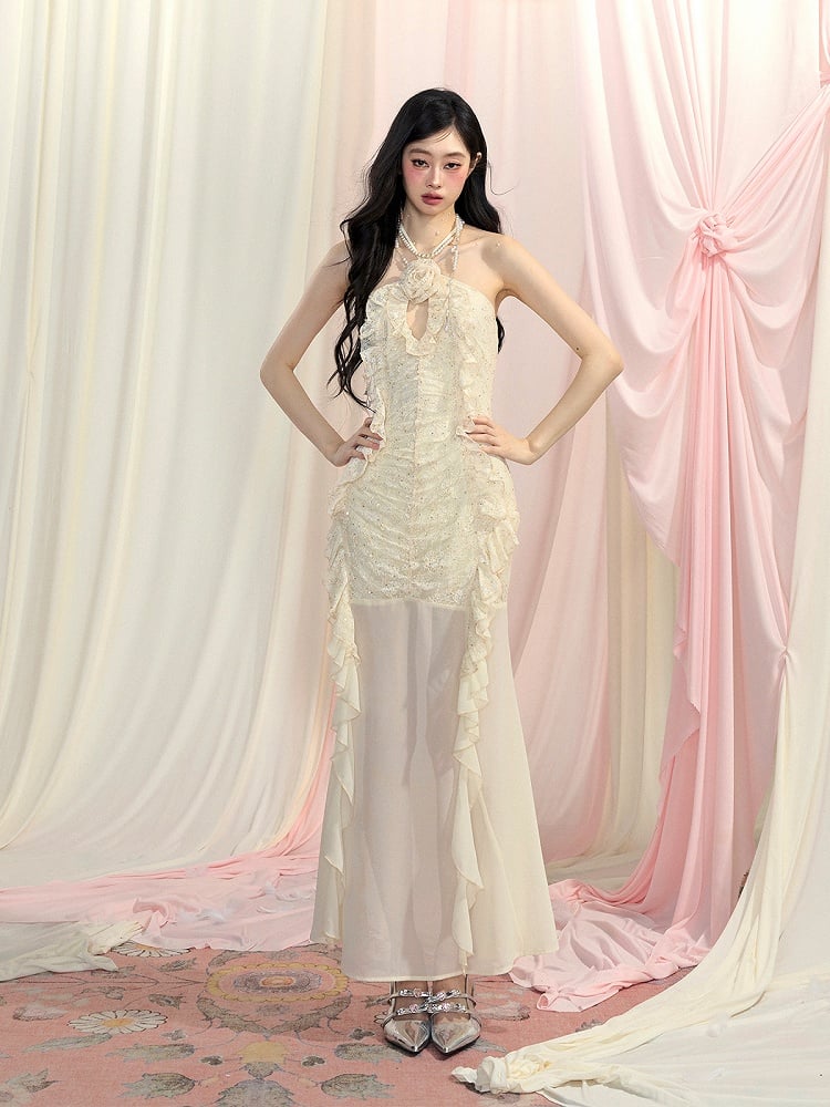 Detail Cascading Ruffle Accents Halter Neck Dress Apricot Cutout