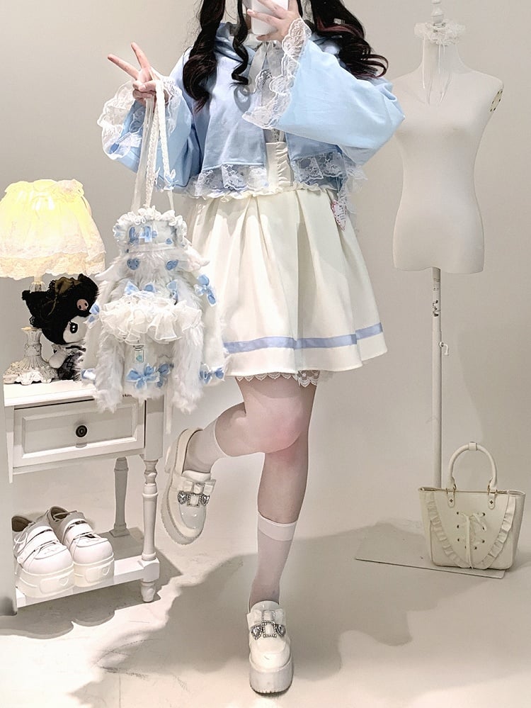 Jirai Kei Short Kitty-Ear Cape with Lace Trim Detail | Black / Pink / Blue