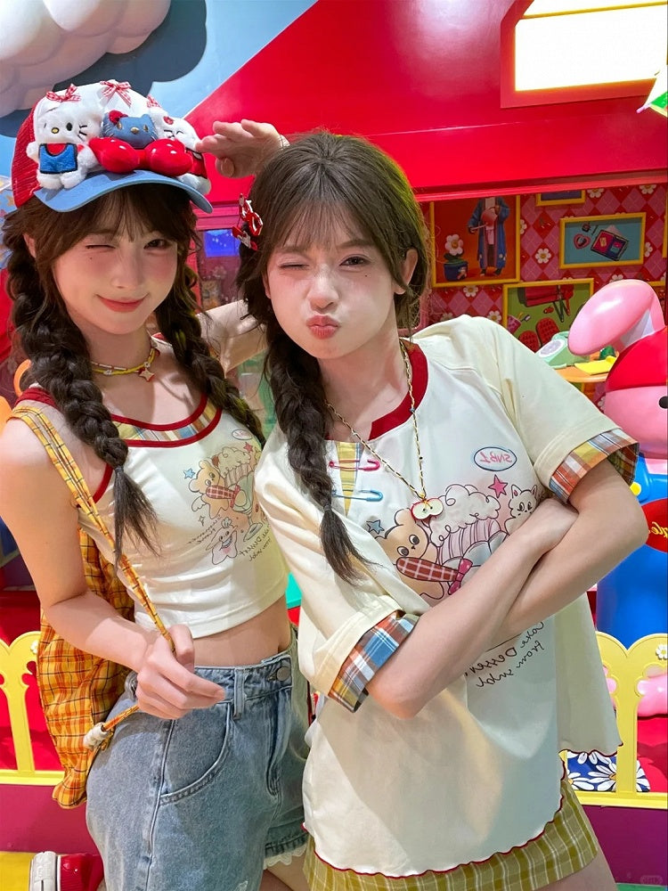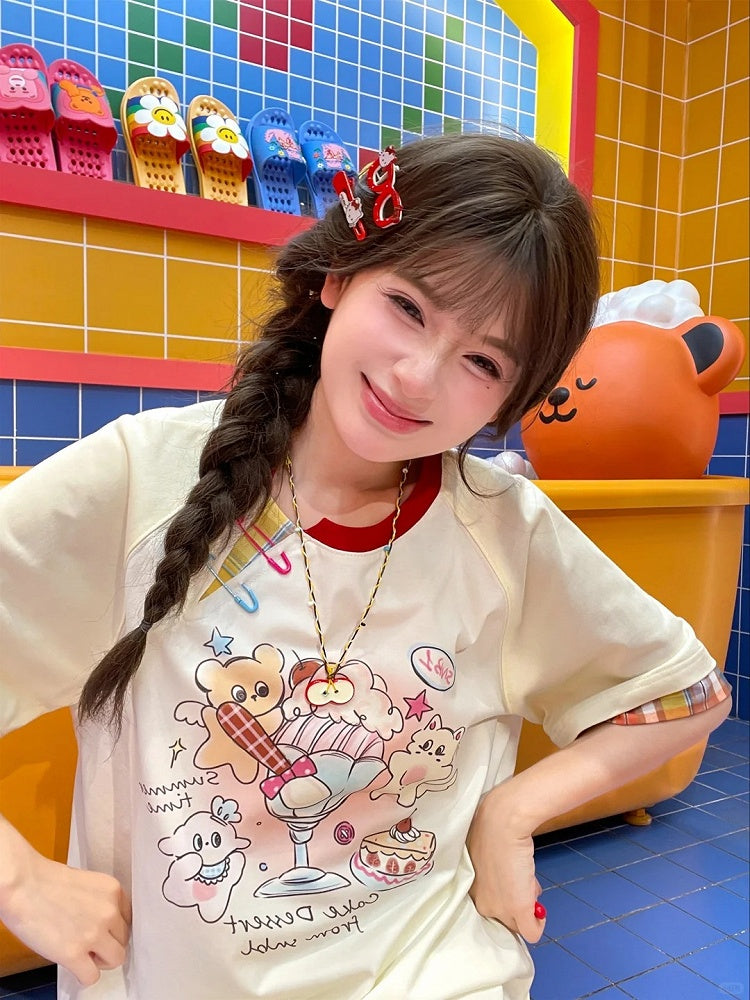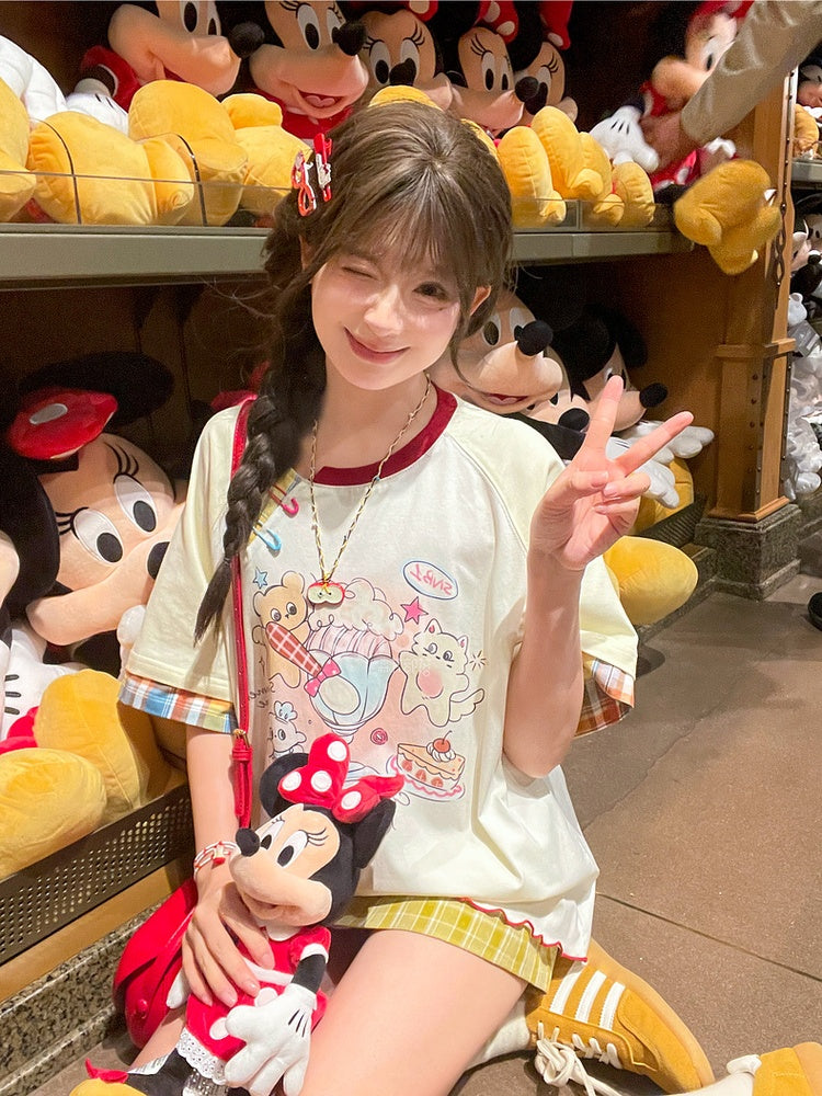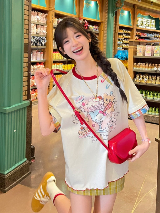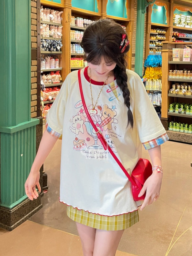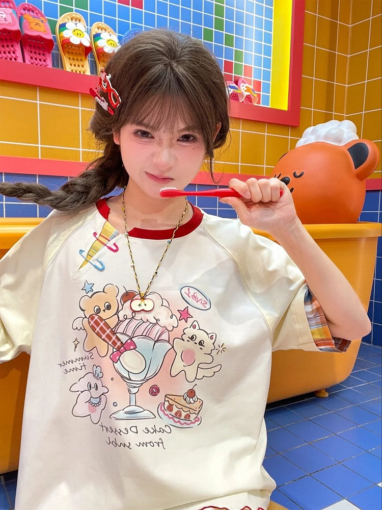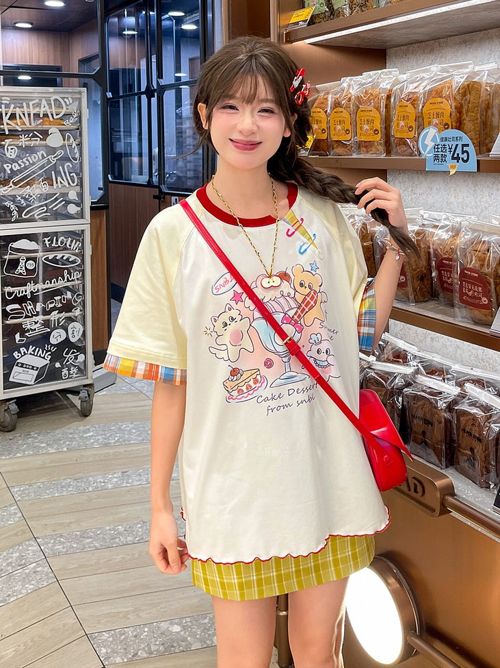 Beige Cartoon Dessert Print Pin Details Neckline Lettuce Hem T-Shirt