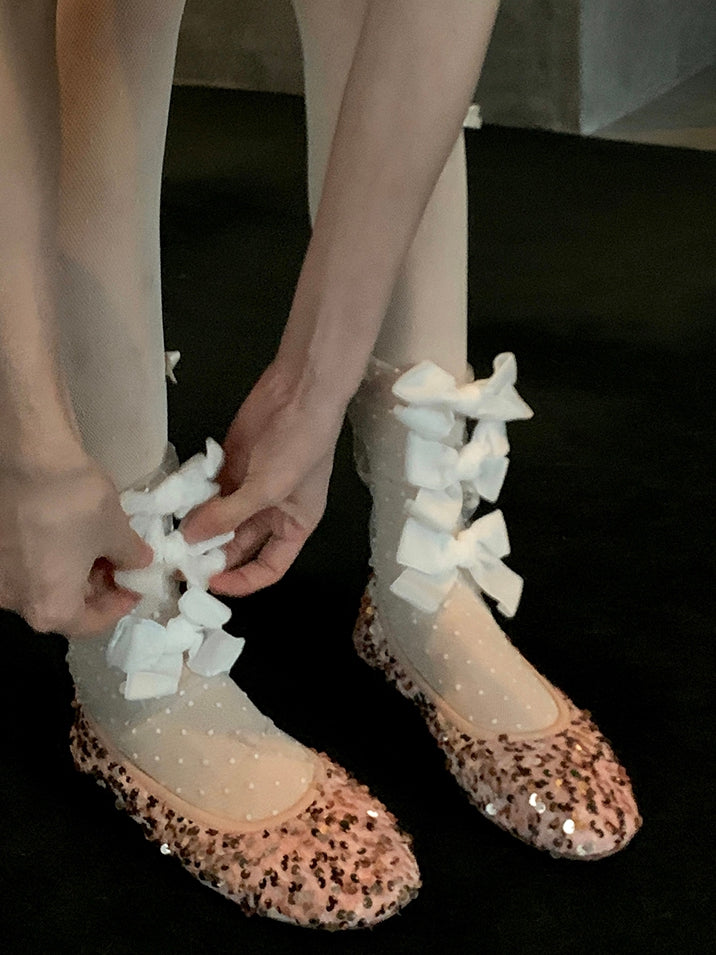White/Black Polka-dot Pattern Bowknot Details Calf Socks