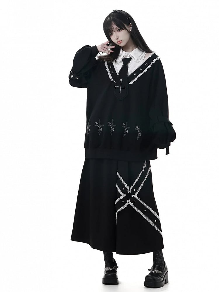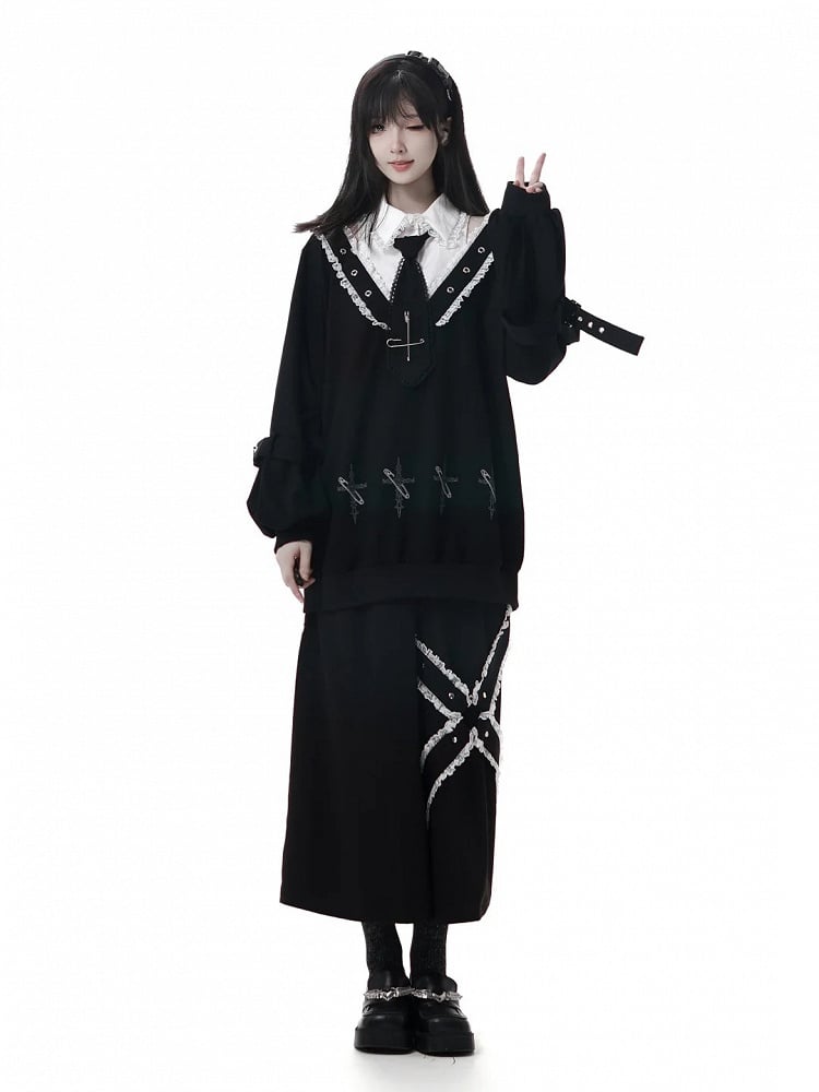 Black Ankle Length Wide-Leg Pants with White Criss-Cross Lace and Stud Details