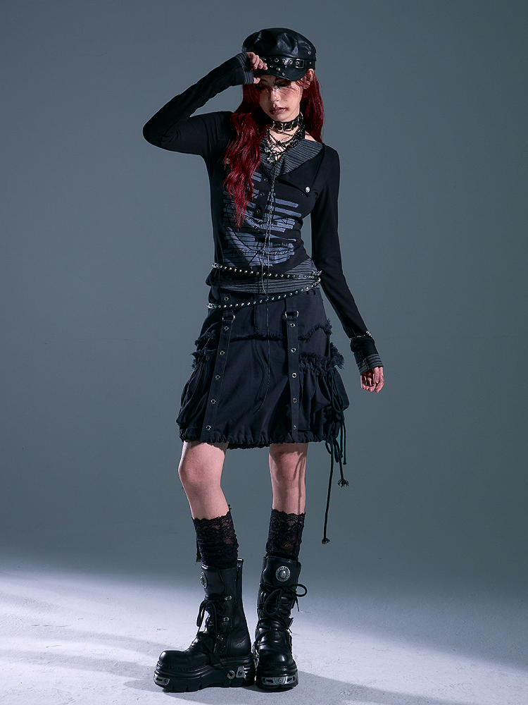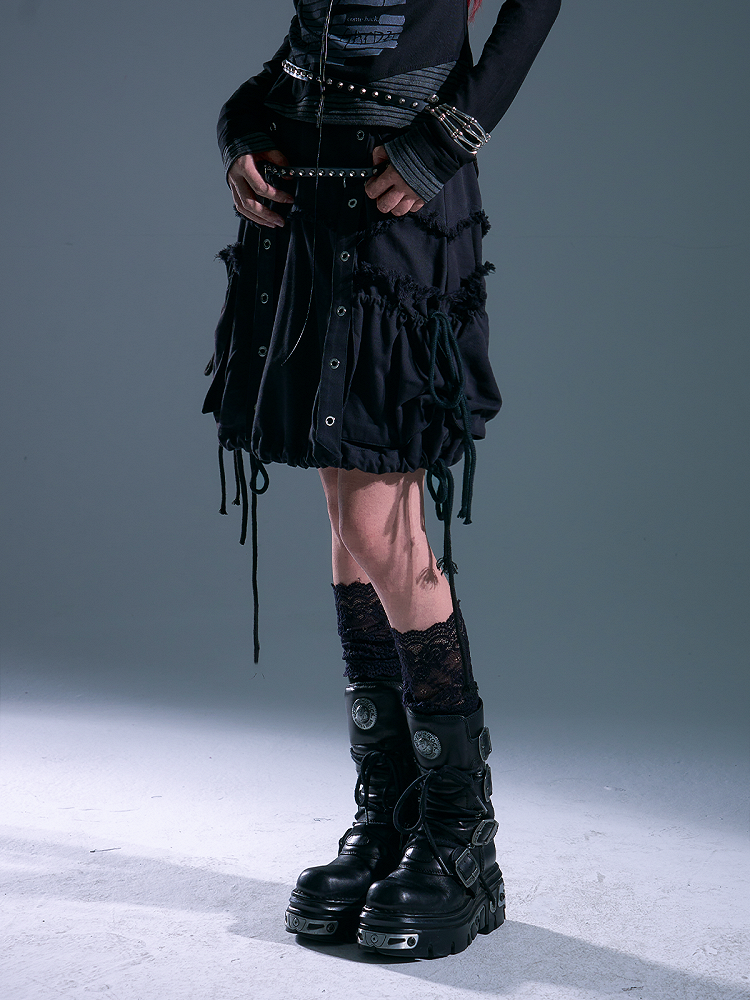 Distressed Side - Design Black Skirt Punk Pockets Drawstring