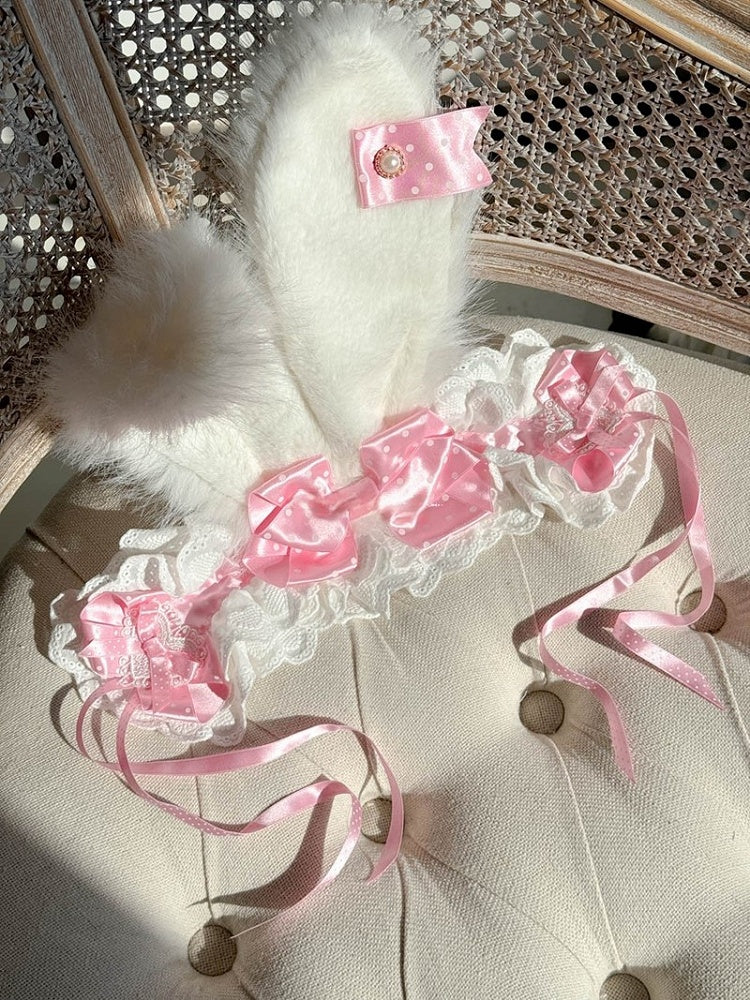 Dot Hairband Bunny Lace Bows Ear and Lolita with Pink Plush Polka Red/Pink/Light Trimmings
