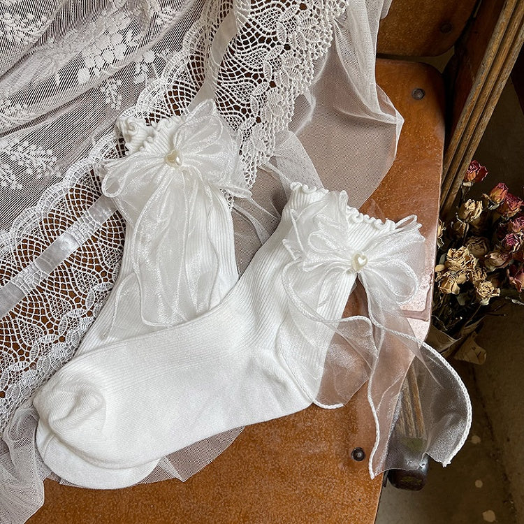 Black/White Double-Layer Mesh Bowknot Heart Bead Socks