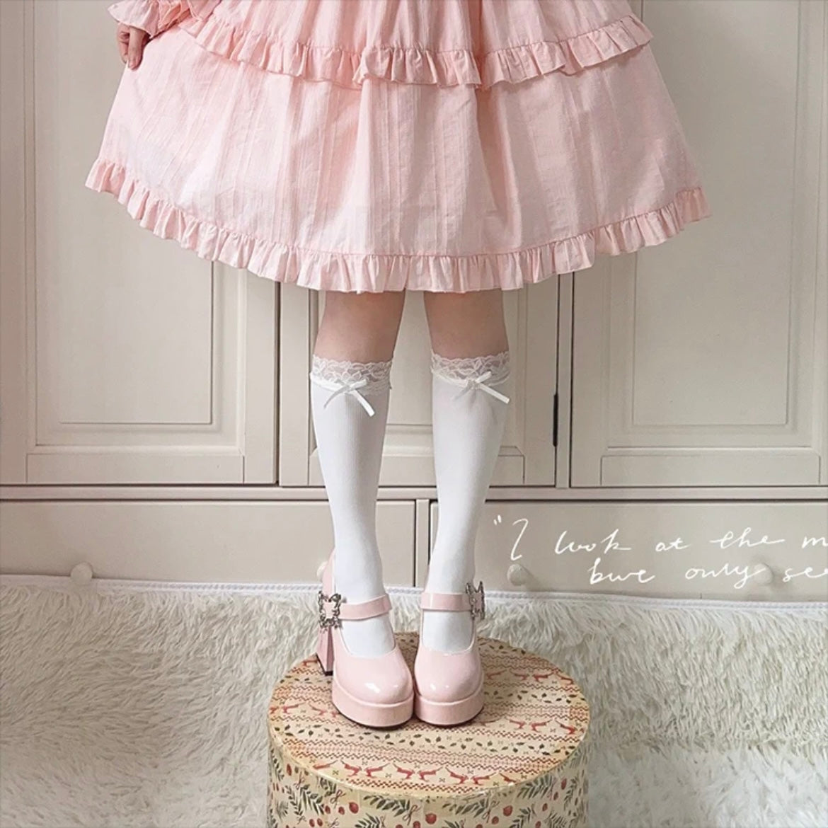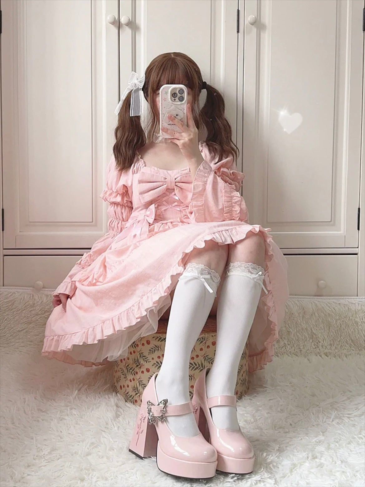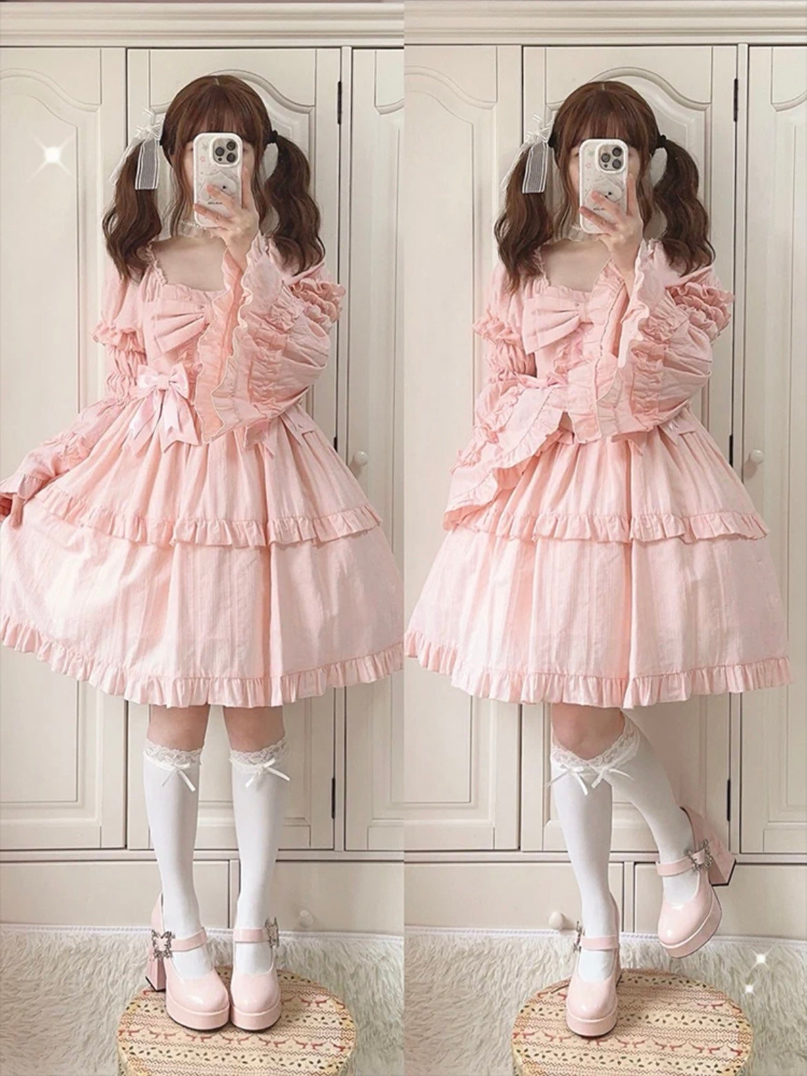 Pink and White Old School Lolita Fashion Dress Bowknot Detais Lolita JSK Set