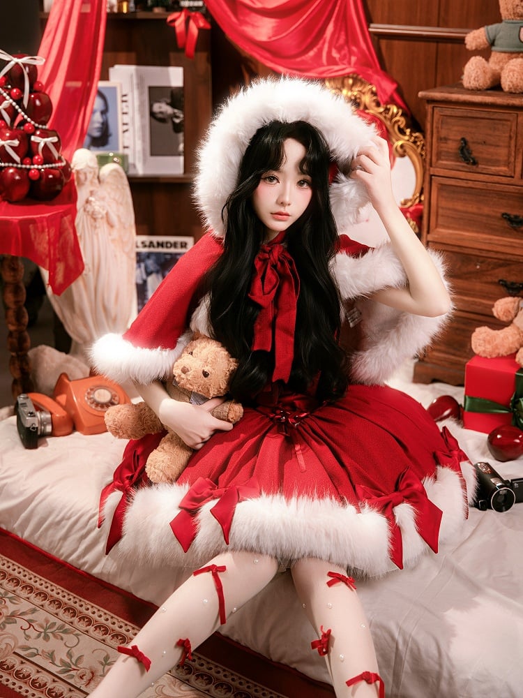 Dress Cape + Full Set Red Christmas Boning and Neckline Bows Decorated Hemline Plush