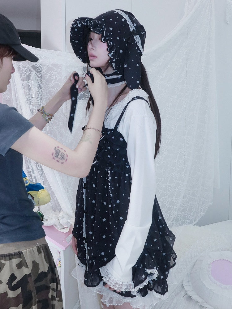 Dress Choker Star Oversized Matching with Tiered Navy Slip Bow White Kawaii Blue Print