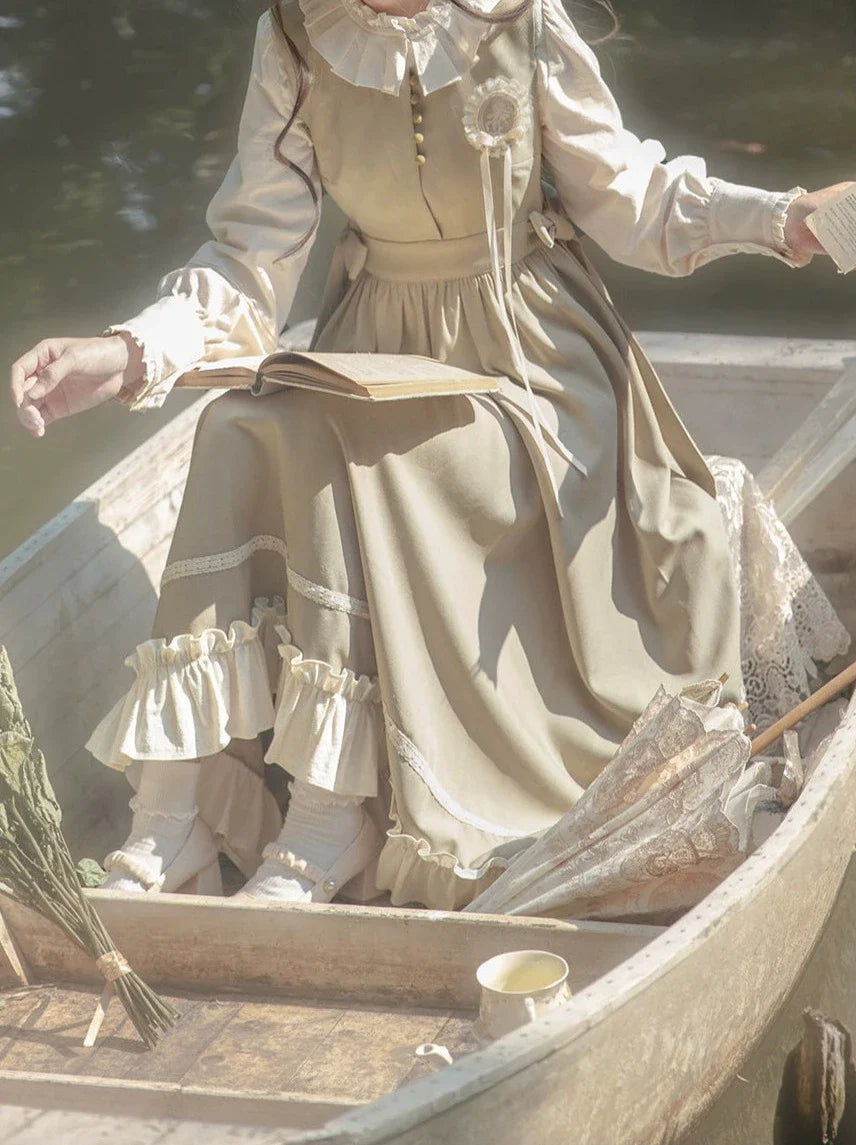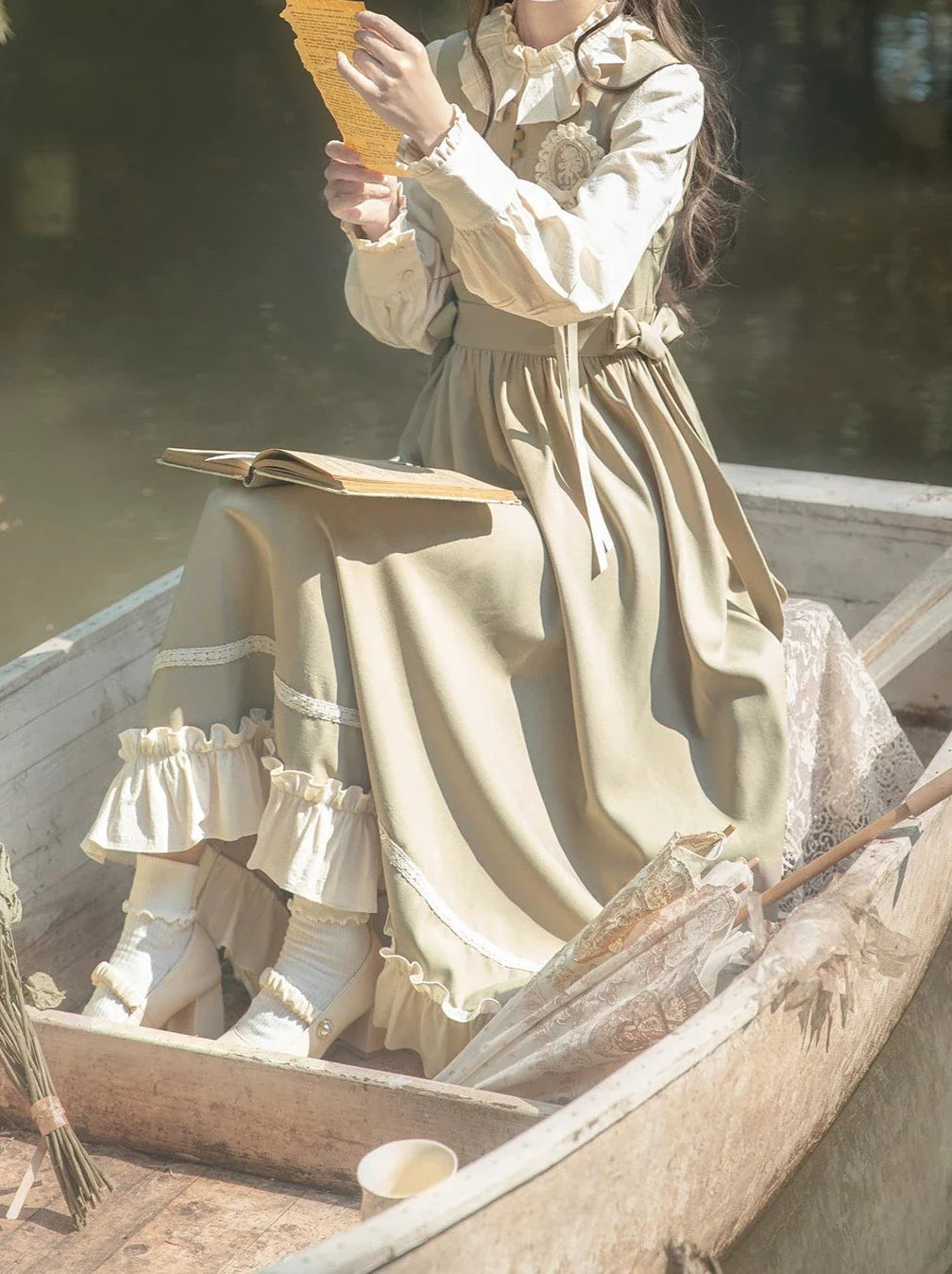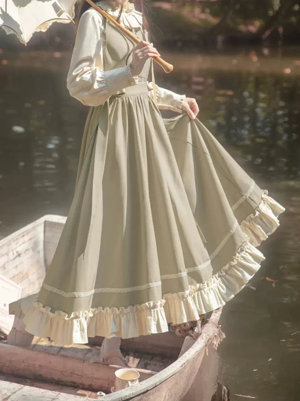 Dress French + Retro Long Ruffle Vest Green Blouse